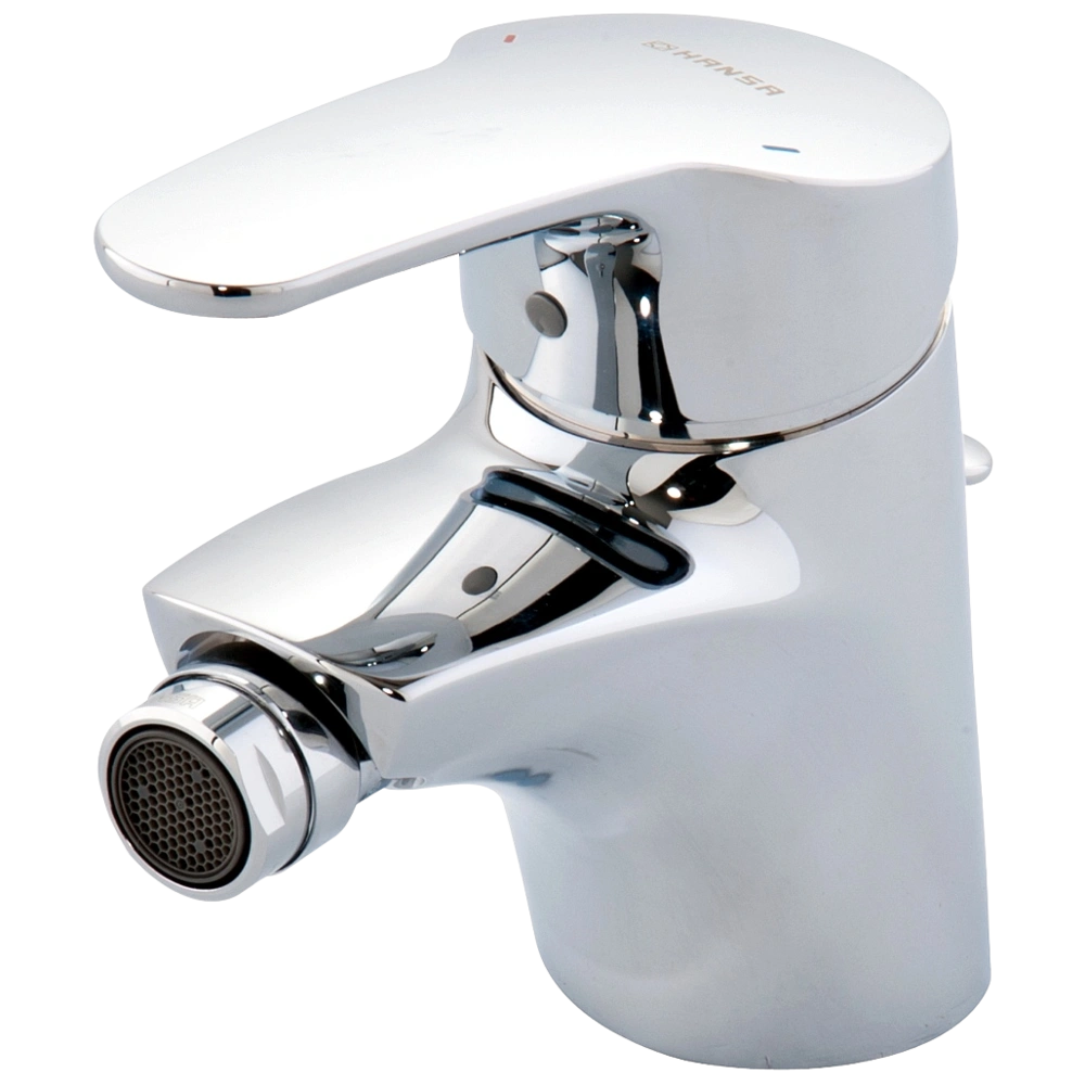 Single-lever bidet mixer with pop-up waste set for single-hole installation. The tap mixer has an operating lever with hot and cold symbols and a ø 4.8 control cartridge with ceramic sealing washers for water rate and temperature adjustment. The aerator provides a constant flow rate independent from the flow pressure. The integrated temperature limiter can be used for the adjustment of a hot-water lock.