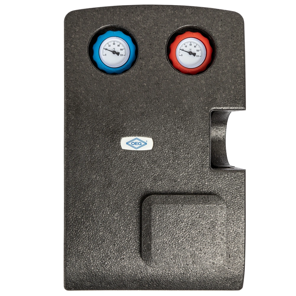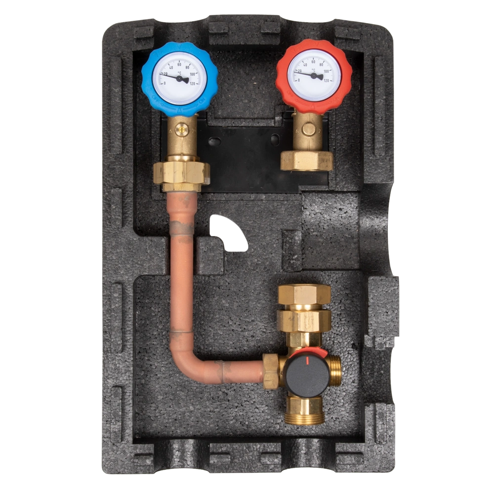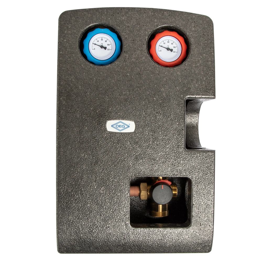 All product informationPump group with ESBE VRG 4-way mixing valve for solid fuel boilers. The 4-way mixing valve prevents condensation or serves as a return temperature increase. Circulation pumps with an overall length of 130 mm can be used. The integrated thermometers on the ball valves allow easy visual inspection. The cut-out in the front insulation is suitable for CPAE pumps with display. The insulation can be adapted for other pump types.