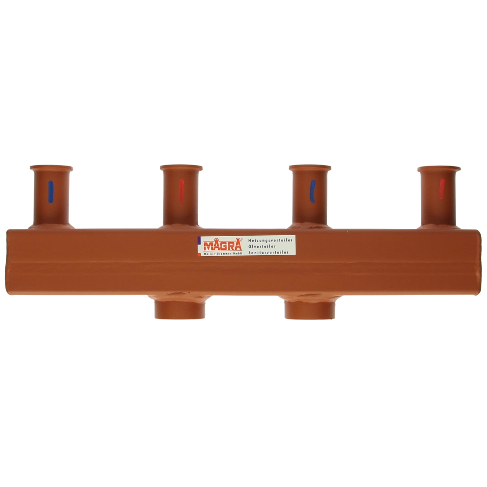 All product informationCombined outflow and return flow distributor for wall mounting or direct mounting on the boiler. The thermally separated chamber for outflow and return flow is positioned above each other and can be insulated with a prefabricated insulation.