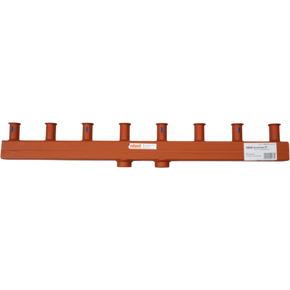 All product informationCombined outflow and return flow distributor for wall mounting or direct mounting on the boiler. The thermally separated chamber for outflow and return flow is positioned above each other and can be insulated with a prefabricated insulation.