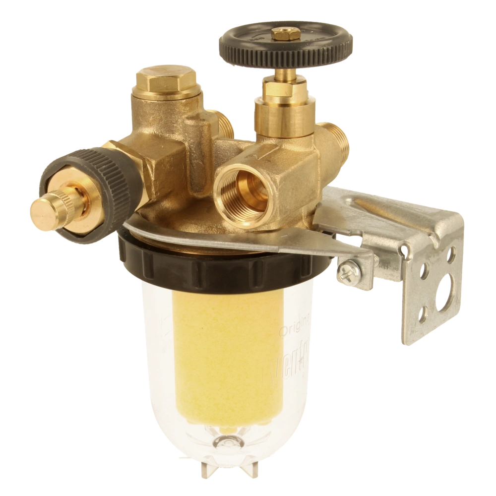 This heating oil filter is equipped with a fast-acting isolating valve and double O-ring sealing. It also has a vent valve for the start-up. Body, valve and mounting bracket are made of brass, as is the mounting bracket. The union nut is made of a zinc-alloy with a black surface. The filter cup for the suction operation is made of Cellidor. The connection with a female thread compression fitting is intended for the tank side and with the male thread for the suction connection. The compression fitting required on the burner side of 6, 8, 10 or 12 mm must be ordered separately.