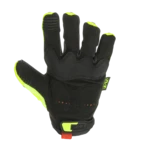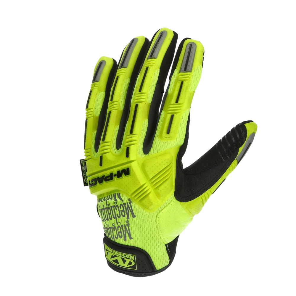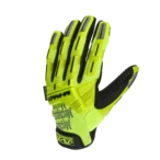 Fluorescent yellow work gloves with particular impact protection on the upper side. For best visibility on the side of the road and on the construction site.