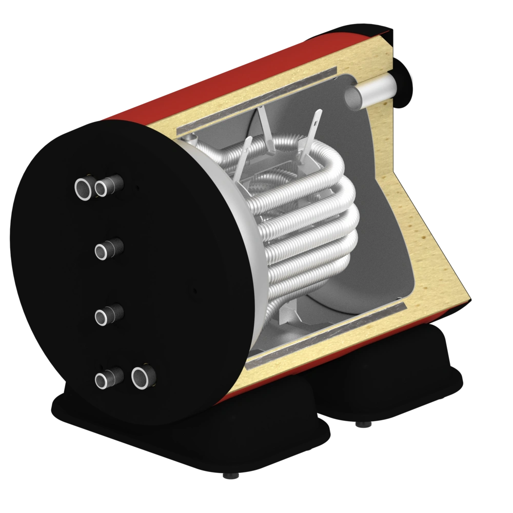 De boiler heeft 1 stalen wisselaar voor glyco en 1 RVS wisselaar voor het tapwater.