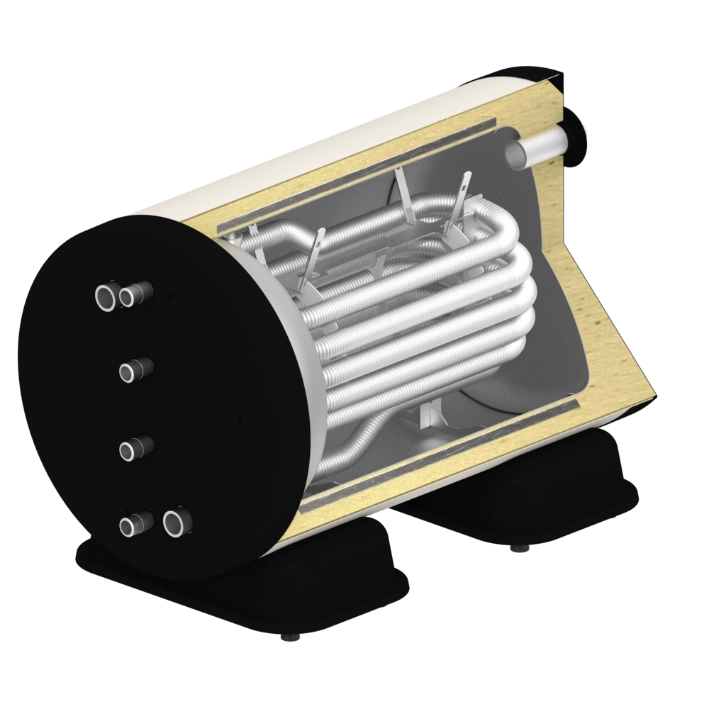 De boiler heeft 1 stalen wisselaar voor glyco en 1 RVS wisselaar voor het tapwater.