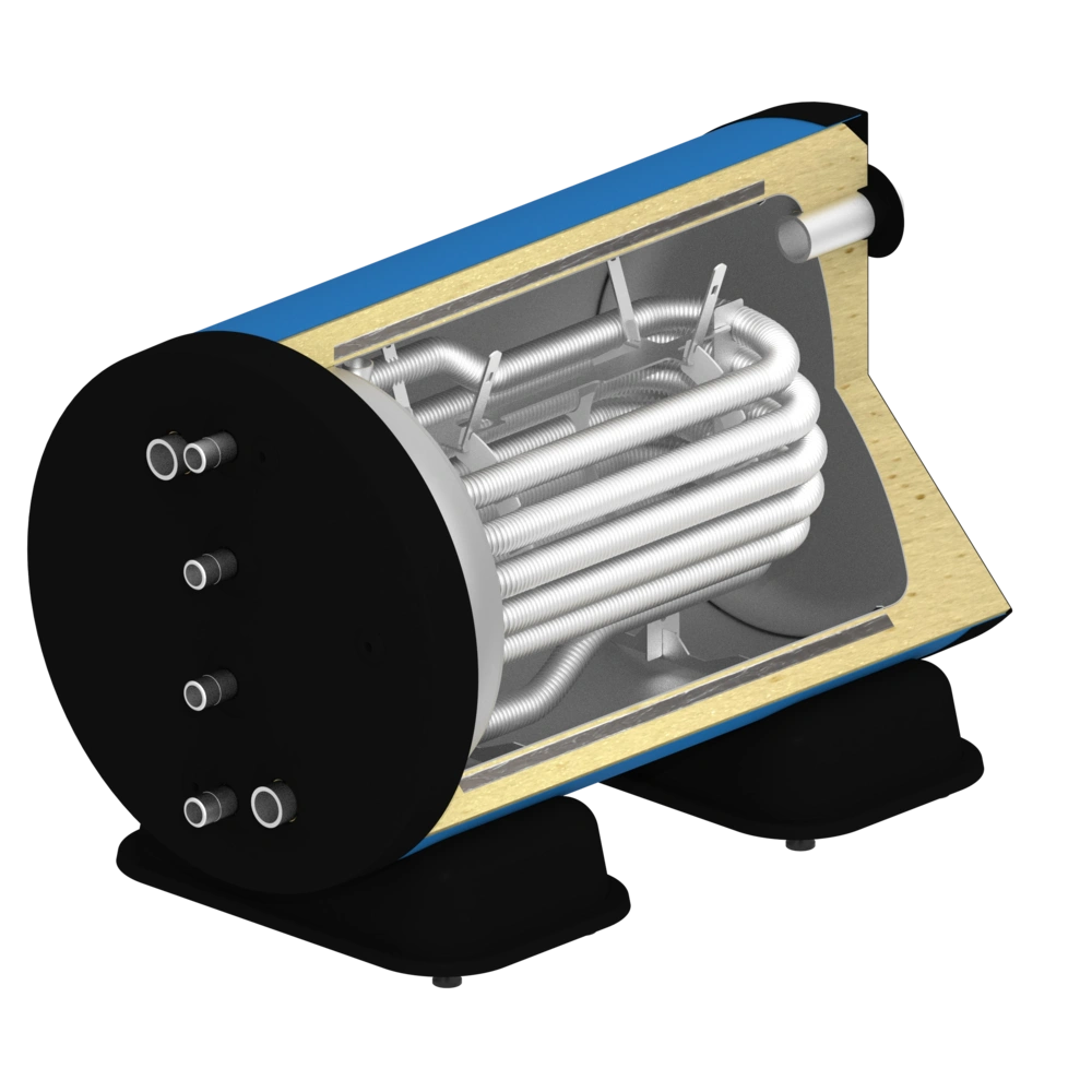 De boiler heeft 1 stalen wisselaar voor glyco en 1 RVS wisselaar voor het tapwater.
