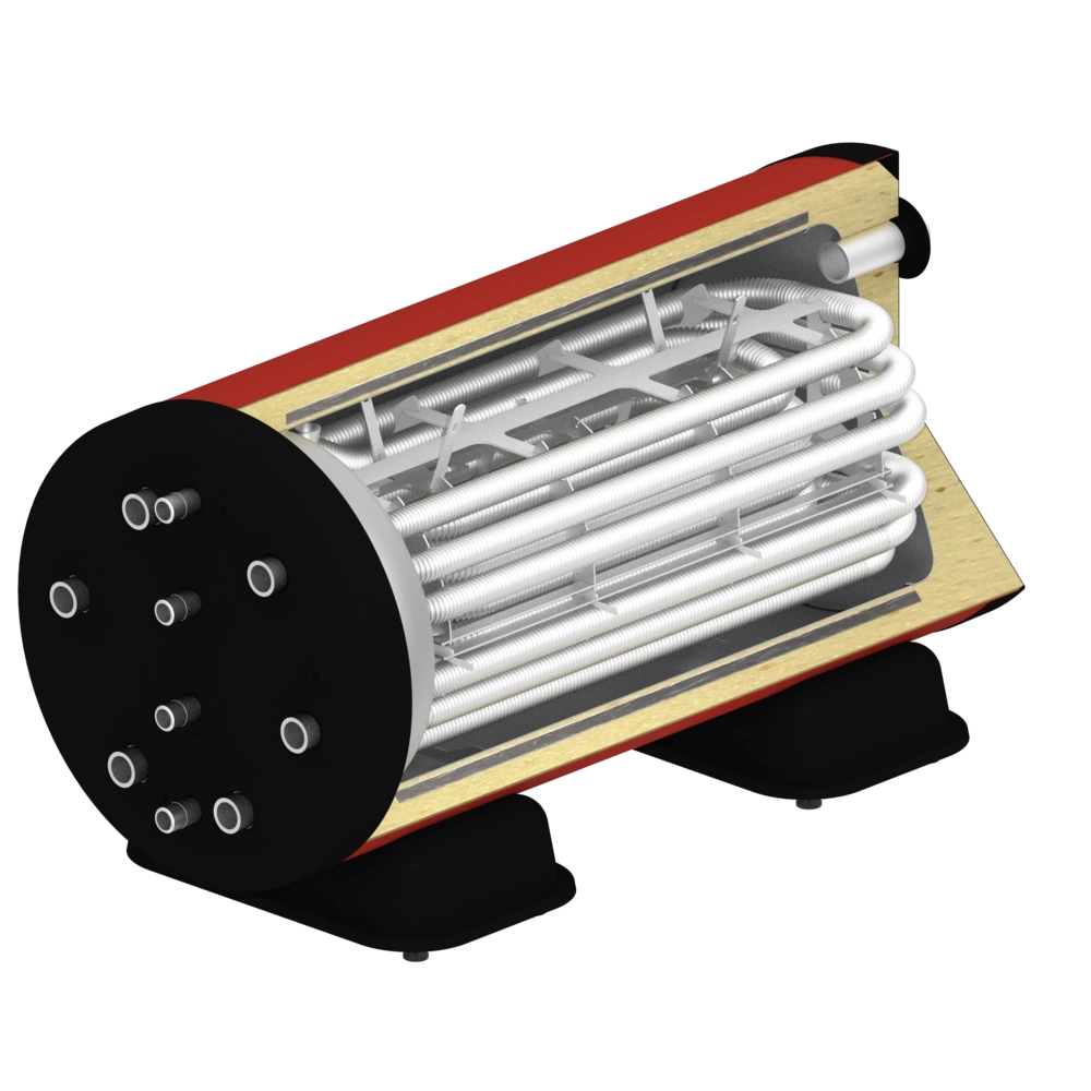 Compare! The horizontal arrangement of the heat exchangers in horizontal OEG fresh-water storage tanks offers your customers advantages over other products on the market. Efficient heat stratification is only achieved by installing the heat exchangers horizontally. The generously dimensioned heat exchanger surfaces provide another energy advantage over other products available on the market.
