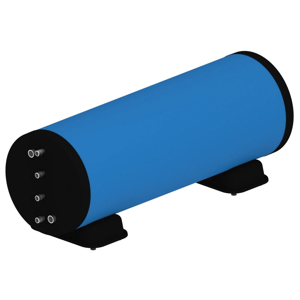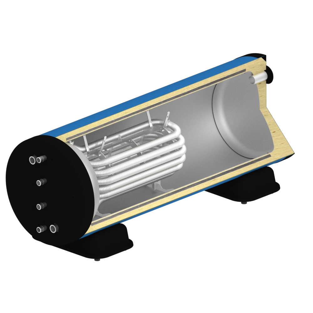 Mocht een liggende boiler de enige mogelijkheid zijn kan beter worden gekozen voor de Horizontal fresh-water storage tank 200 litres with 2 extra HXs met twee extra buiswisselaars (gezien de warmteoverdracht van warmtepomp naar het opslagvat)