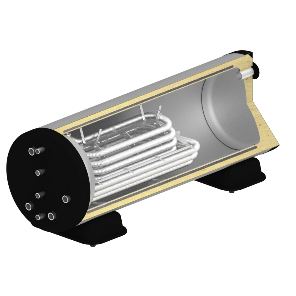Compare! The horizontal arrangement of the heat exchangers in horizontal OEG fresh-water storage tanks offers your customers advantages over other products on the market. Efficient heat stratification is only achieved by installing the heat exchangers horizontally. The generously dimensioned heat exchanger surfaces provide another energy advantage over other products available on the market.