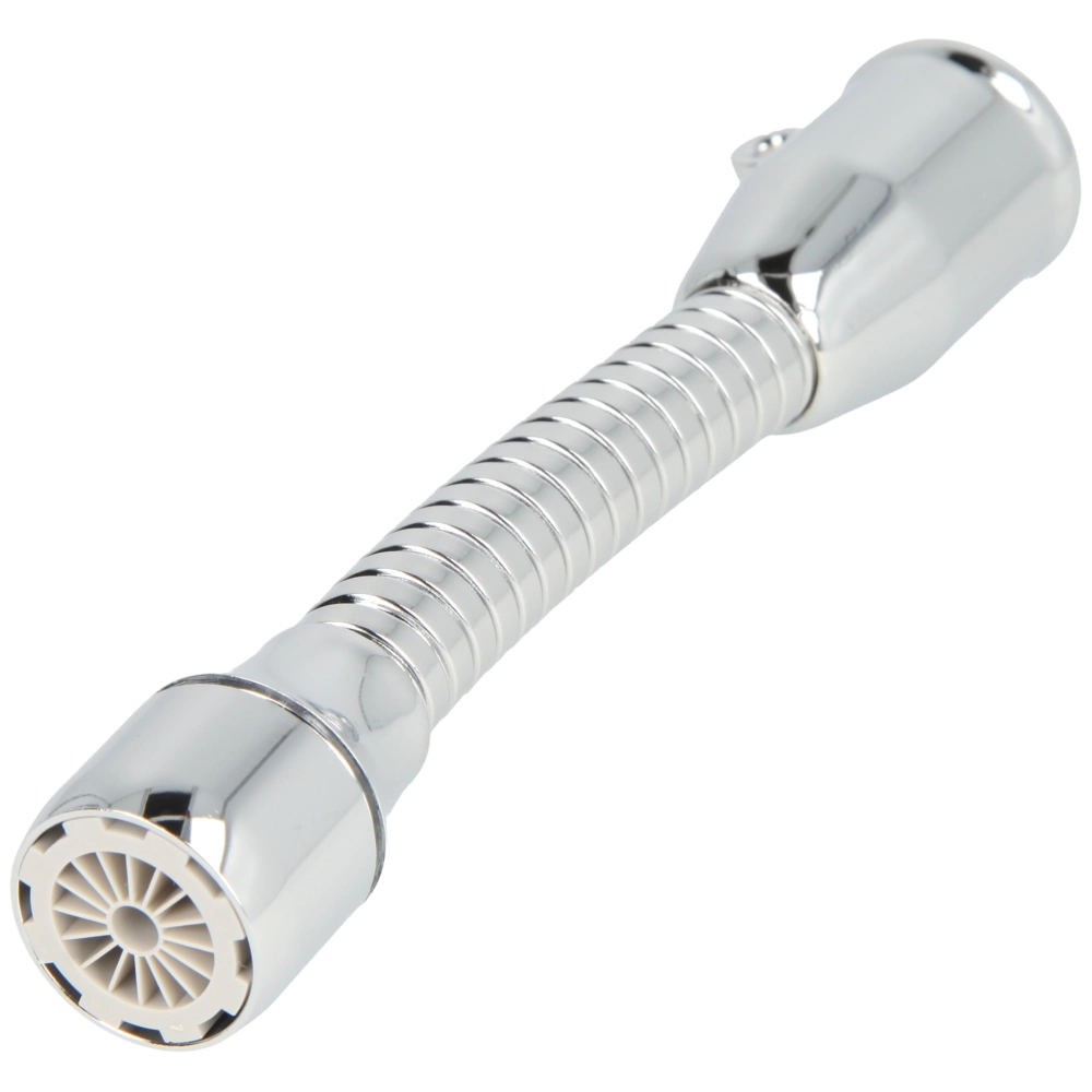 Extended, flexible spout made of chrome-plated metal with soft sprayer and clamp.