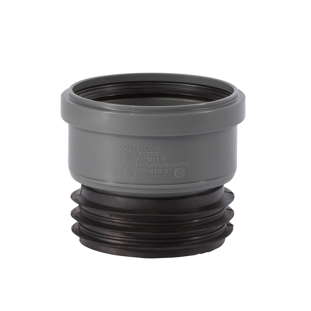 HT universal push-fit socket made of flame-retardant polypropylene with a one-sided socket, triple sealing lip, and push-in gasket for wastewater pipes inside buildings according to DIN EN 1451. The socket is suitable for hot, cold and aggressive wastewater as well as for central vacuum systems.