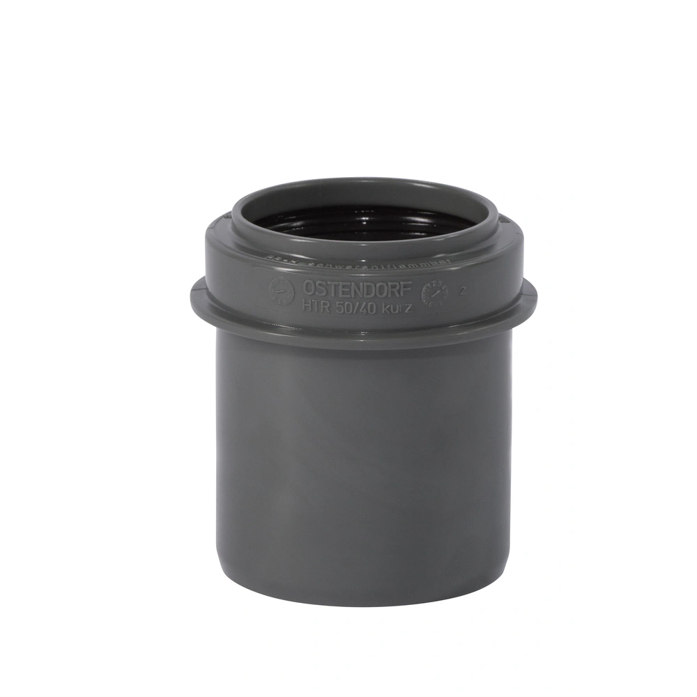 Ultra-short HT reducer made of flame-retardant polypropylene with plug-in socket on one end and 3-lip seal for wastewater pipes within the building structure according to DIN EN 1451.