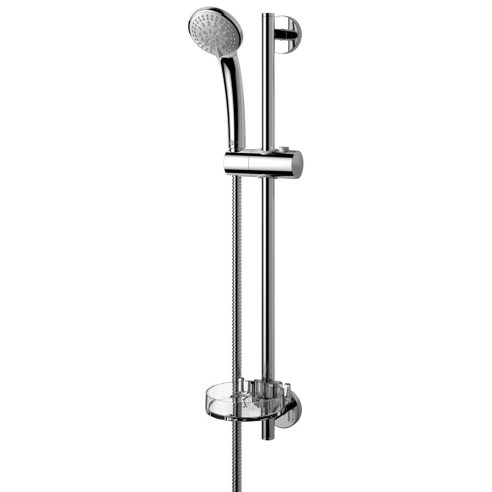 All product information Scope of deliveryShower combination with hand spray, shower rail and swivelling pressbutton slider. The hand spray with anti-limescale function provides the spray modes rain, downpour and massage jet. The shower set includes a transparent soap dish and a shower hose.