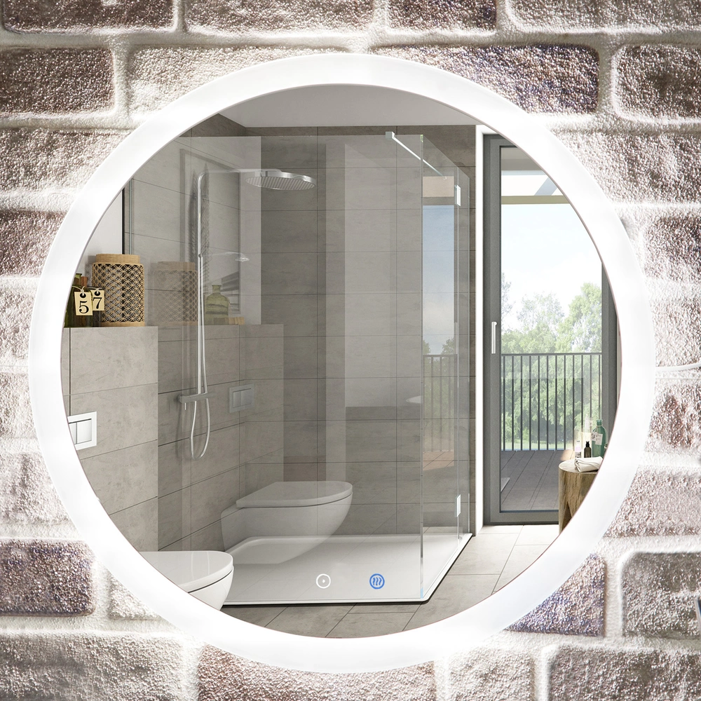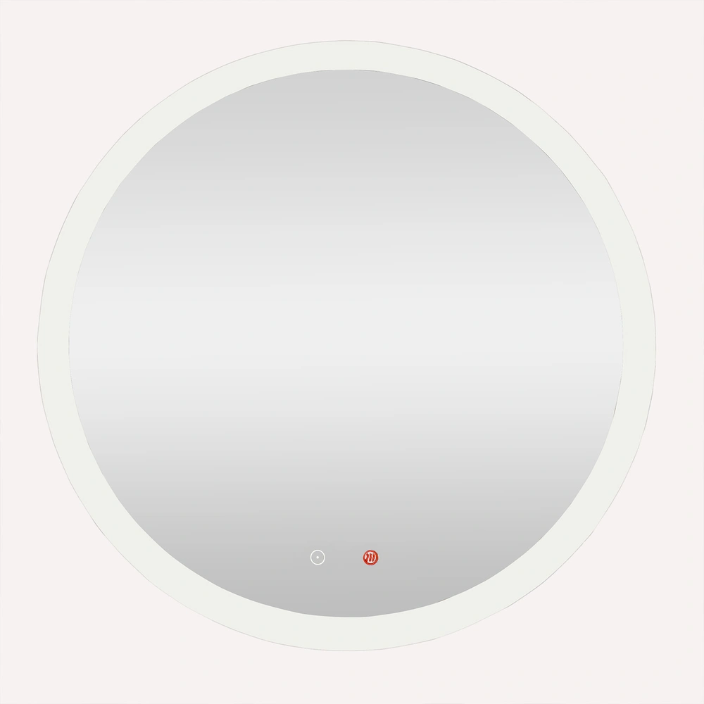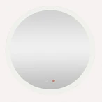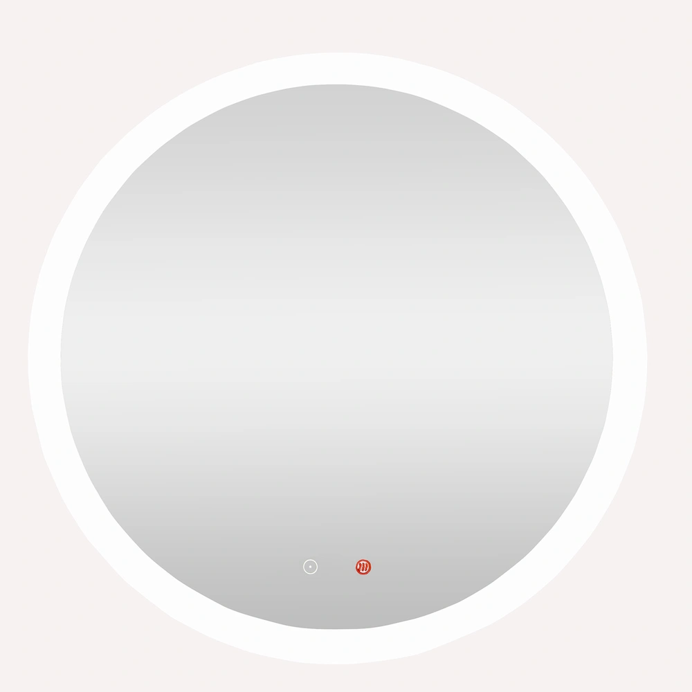 High-quality illuminated LED mirror with satin-finished rim and anti-fog function. The mirror can be switched on and off or dimmed via touch symbols. The touch symbol is colour-marked for the anti-fog function.