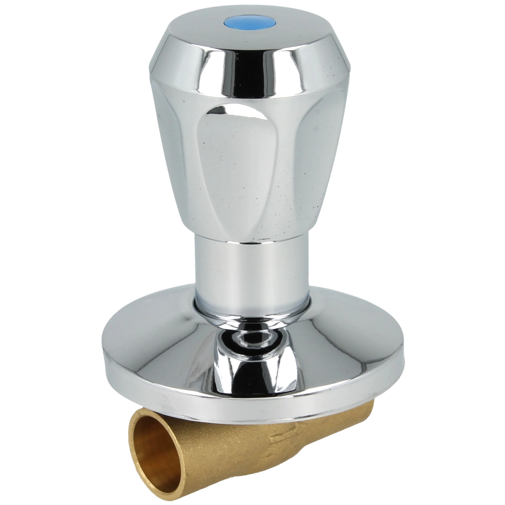 In-wall valve for cold water with soldering socket Ø 18 mm, heat-insulated handle and push rosette.