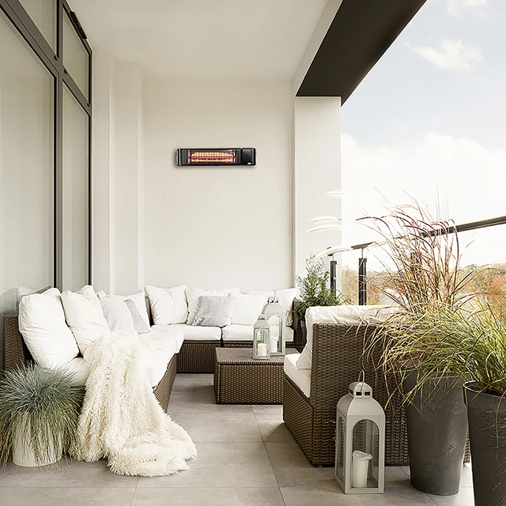 Infrared heater with visibly glowing heating medium as ideal heat source where quick and direct heat in the outdoor area is needed. Cosy warmth within a few minutes on the terrace, balcony, patio and loggia...