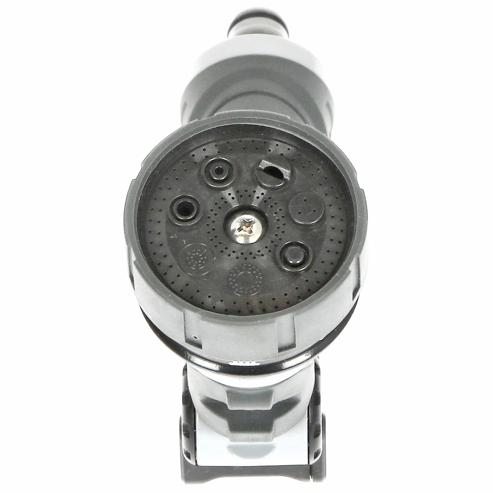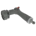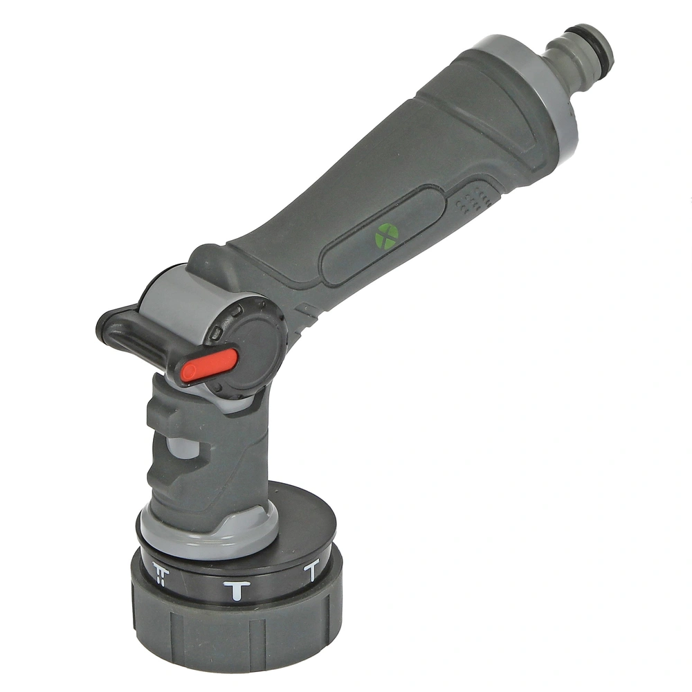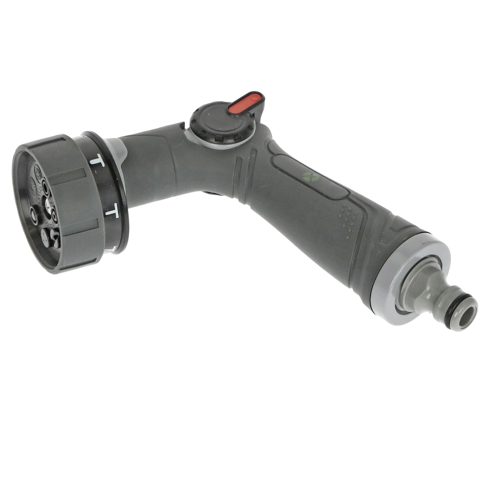 All product informationHigh quality spray gun with 7-way adjustable nozzle and rubberised soft handle suitable for garden irrigation and cleaning purposes. Imprinted icons on the front spray wheel simplify the quick choice and adjustment of the desired spray pattern. The plug-in and click system is compatible with all commercially available systems.