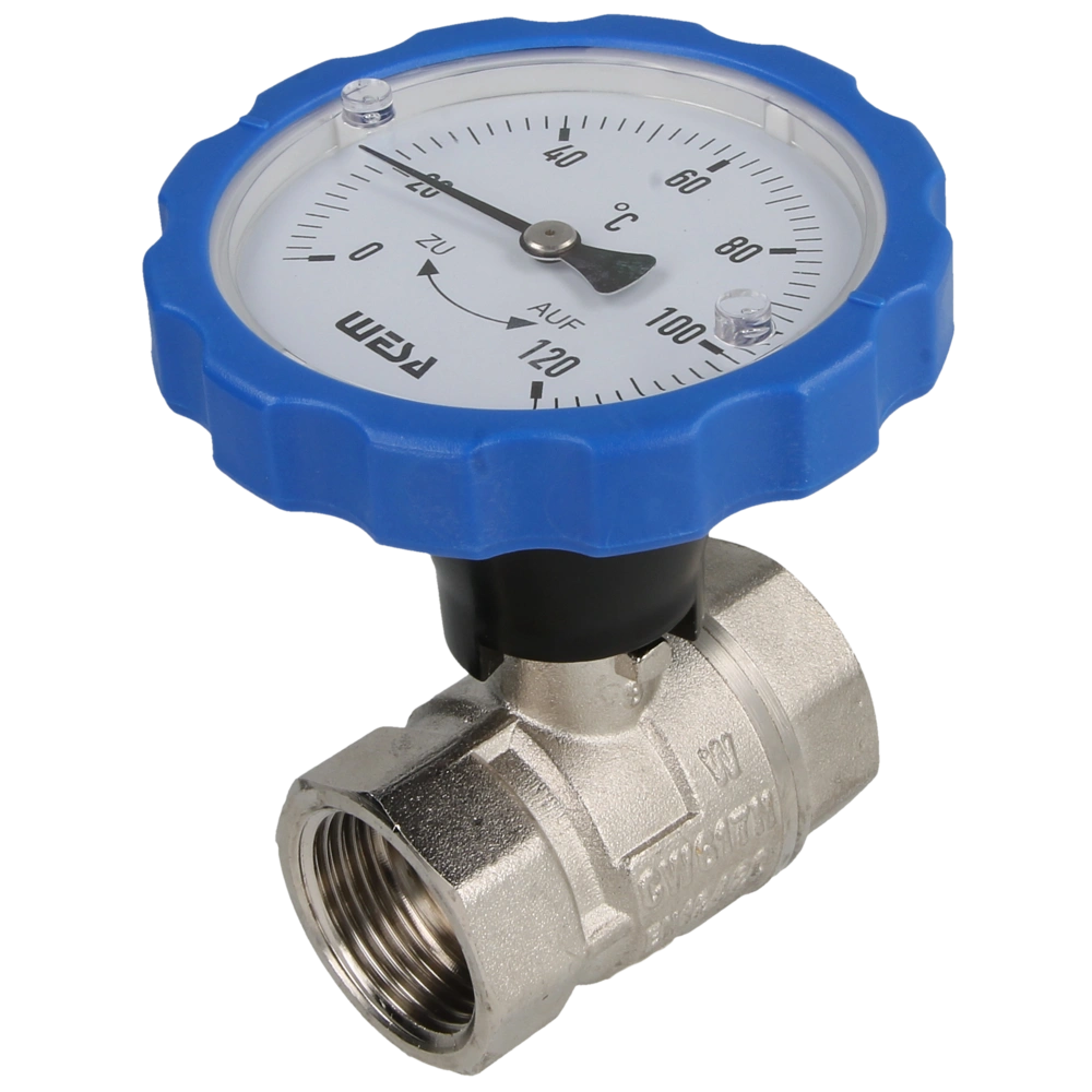 The ball valve is nickel-plated and a heavy-duty model with thermometer handle. It has a full bore, can be fully insulated and is equipped with a packing gland. The thread is standardised as per ISO 228/1.