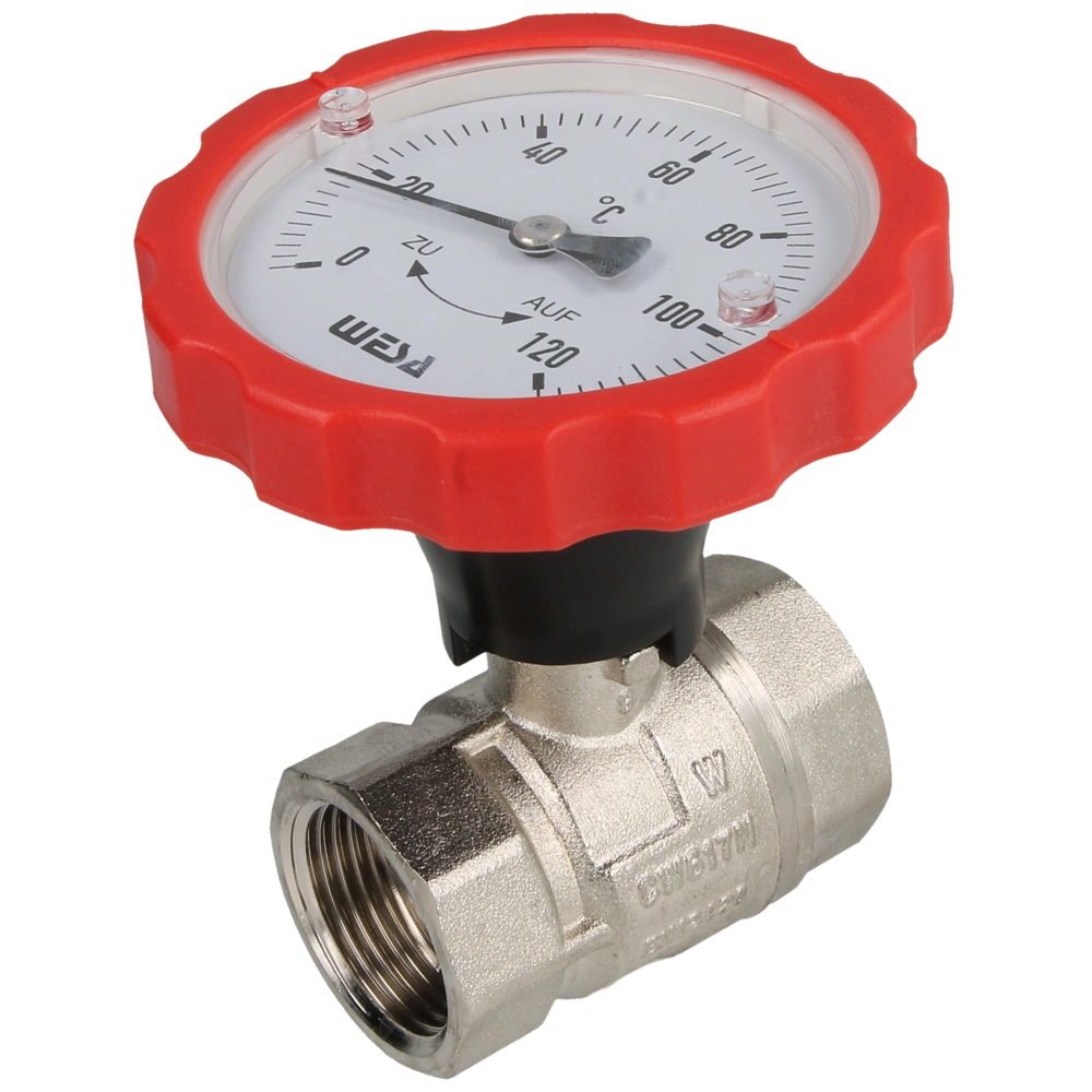 The ball valve is nickel-plated and a heavy-duty model with thermometer handle. It has a full bore, can be fully insulated and is equipped with a packing gland. The thread is standardised as per ISO 228/1.
