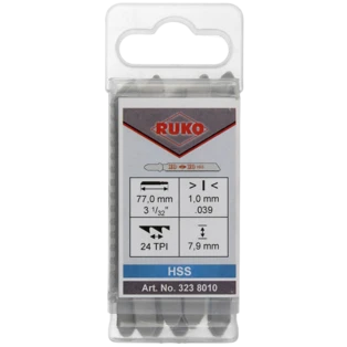 Ruko jigsaw blades in a pack of 20 are suitable for sawing metals like steel, stainless steel, non-ferrous metal and aluminium depending on the model. Also plastic material, plexi glass, hard and soft wood as well as insulation material, composite materials, sandwich material, profiles and polystyrene can be worked on with these saw blades. Cutting oil or water are suitable for cooling purposes for individual applications. The specific application ranges can be found under the individual items.