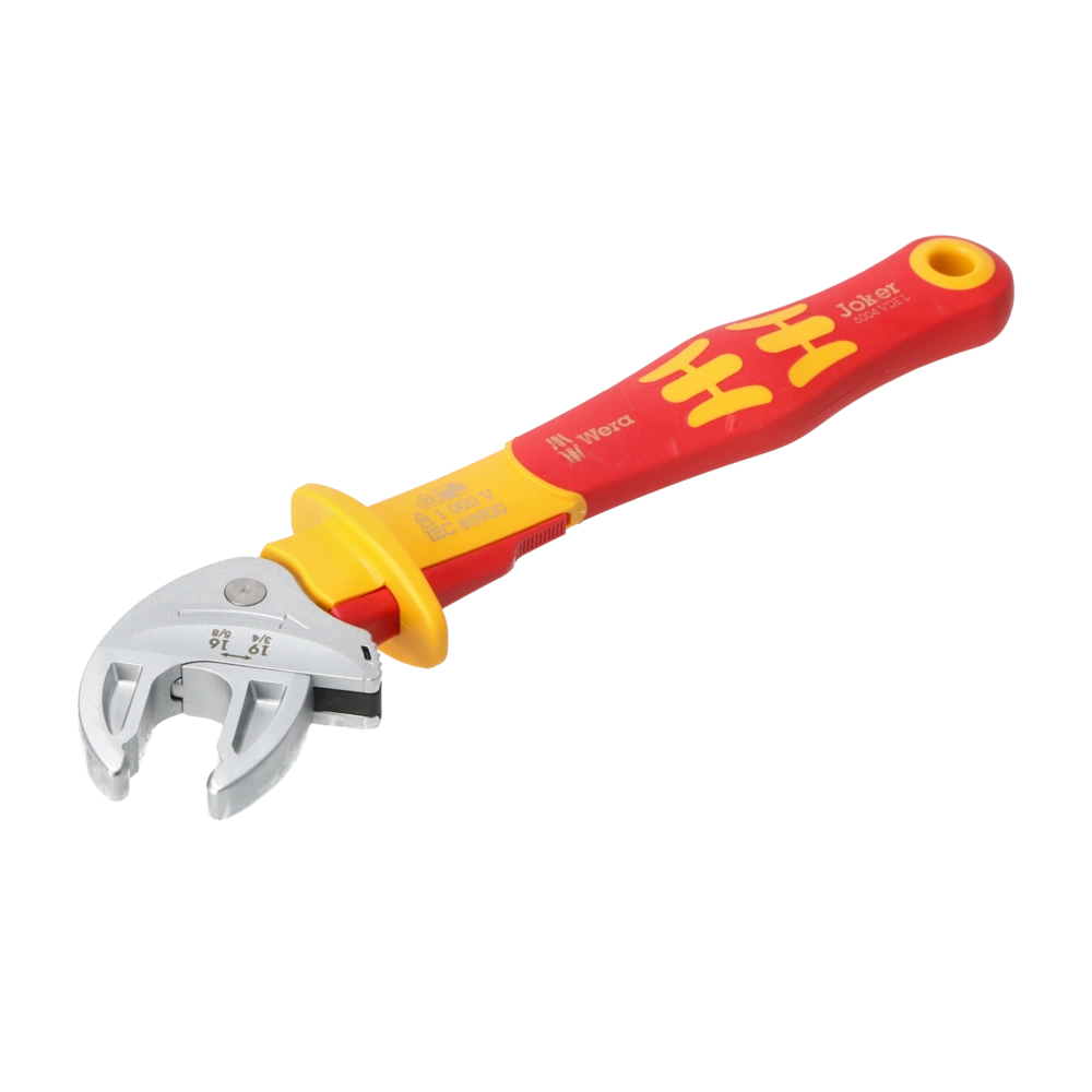 Self-setting spanner for safe working with voltages of up to 1,000 V. The required size is automatically and continuously set when attaching the tool to the hexagon screw or bolt. The ratchet feature ensures fast and consistent screwdriving without removing the tool. By using the corner-width rectangular prisms, a return angle of only 30° can be achieved, which makes it possible to work in confined spaces.