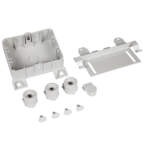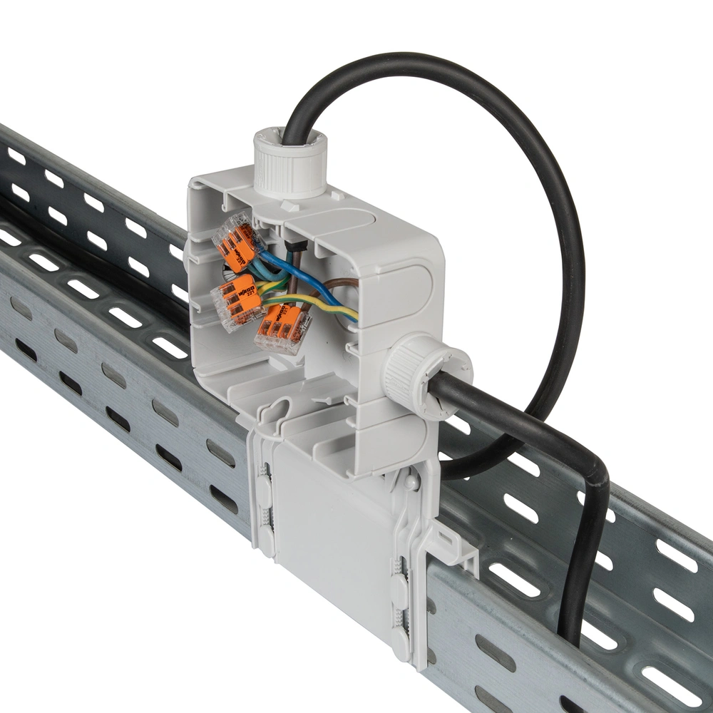 Junction box with straight mounting bracket for cable support systems. The modular junction box is simply plugged onto the cable support system and fixated by pins. The box can be used either with a...