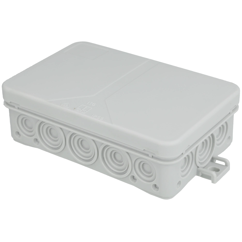 The junction box tested according to DIN EN 60670 (VDE 0606) has 16 pre-punched side entries and 3 floor entries can be drilled open additionally. The fixing lugs are positioned externally.