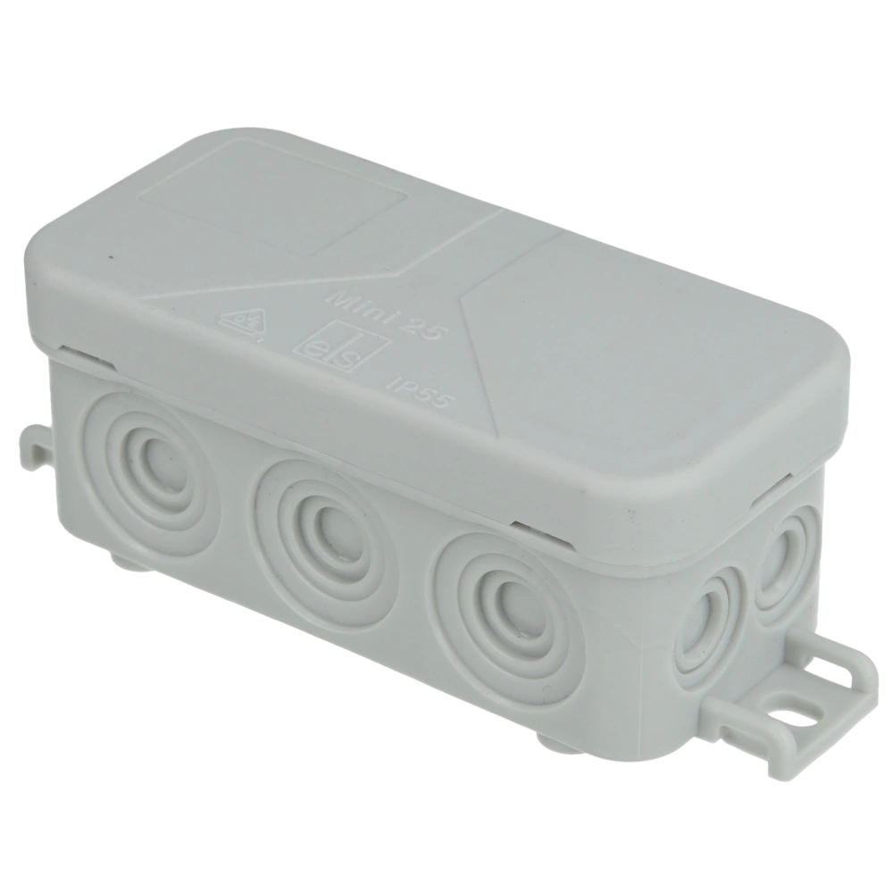 Junction box tested according to DIN EN 60670 (VDE 0606), suitable for installations in confined areas with 2 external fixing points. 10 pre-punched side entries and 2 floor entries can be drilled open additionally...