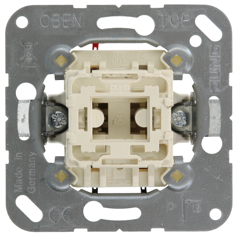 Illuminated, universal 2-way switch insert for flush-mounted installation with spring terminals for toolfree cable connection.