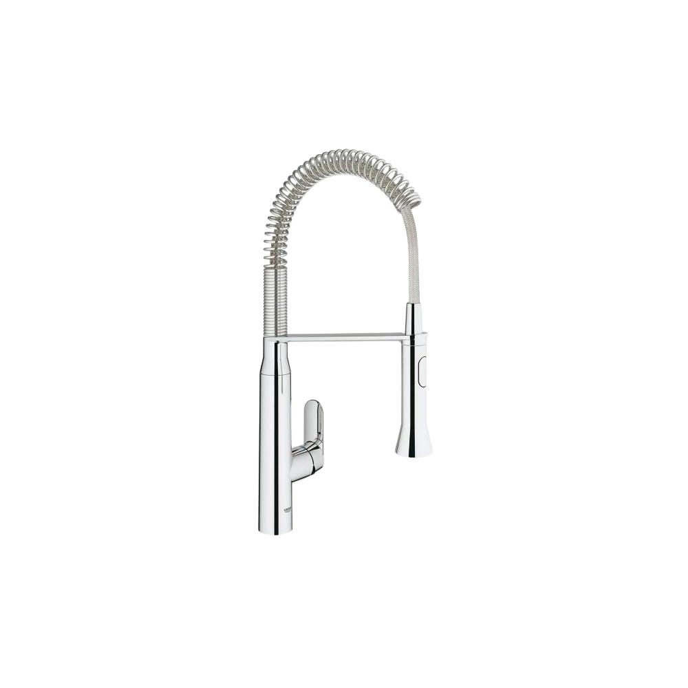 The K7® single-lever sink mixer with pull-out SpeedClean professional spray head is equipped with a GROHE 35 mm SilkMove® ceramic cartridge for continuously variable adjustment of water temperature and volume. The volume can be adjusted by the variable flow rate limiter. The medium-high spout has a swivel range of 140° and the professional metal spray head with automatic reset from SpeedClean to mousseur spray has a swivel range of 360°. The faucet is protected against backflow.