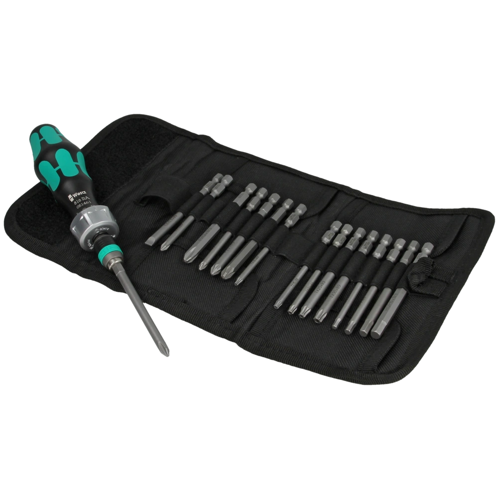 The 17-piece set with 89 mm long bits is supplied in a folding pouch. The hand holder 816 RA Kraftform with ratchet function has fine-pitched teeth for a small return angle. The switchover ring...