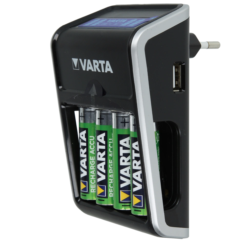Plug charger to be used worldwide for quick charging of up to 4 AA or AAA batteries at the same as well as for a 9V battery block. An external device can be charged via USB port at the same time. The charging time is within 4 hours. An LC display indicates the respective charging process. The charger with trickle charge is provided with safety functions such as Minus Delta U cut-off, temperature monitoring, safety timer and short circuit protection. Damaged or unsuitable battery types can also be detected. The LCD charger is supplied with 4 Mignon AA batteries.