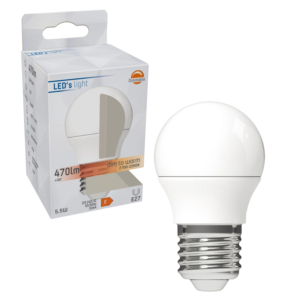 Dimmable LED bulb in round shape. Warm-white light provides for a pleasant and uniform room illumination. Due to the dim-to-warm technology, the colour temperature becomes increasingly warmer when dimmed.