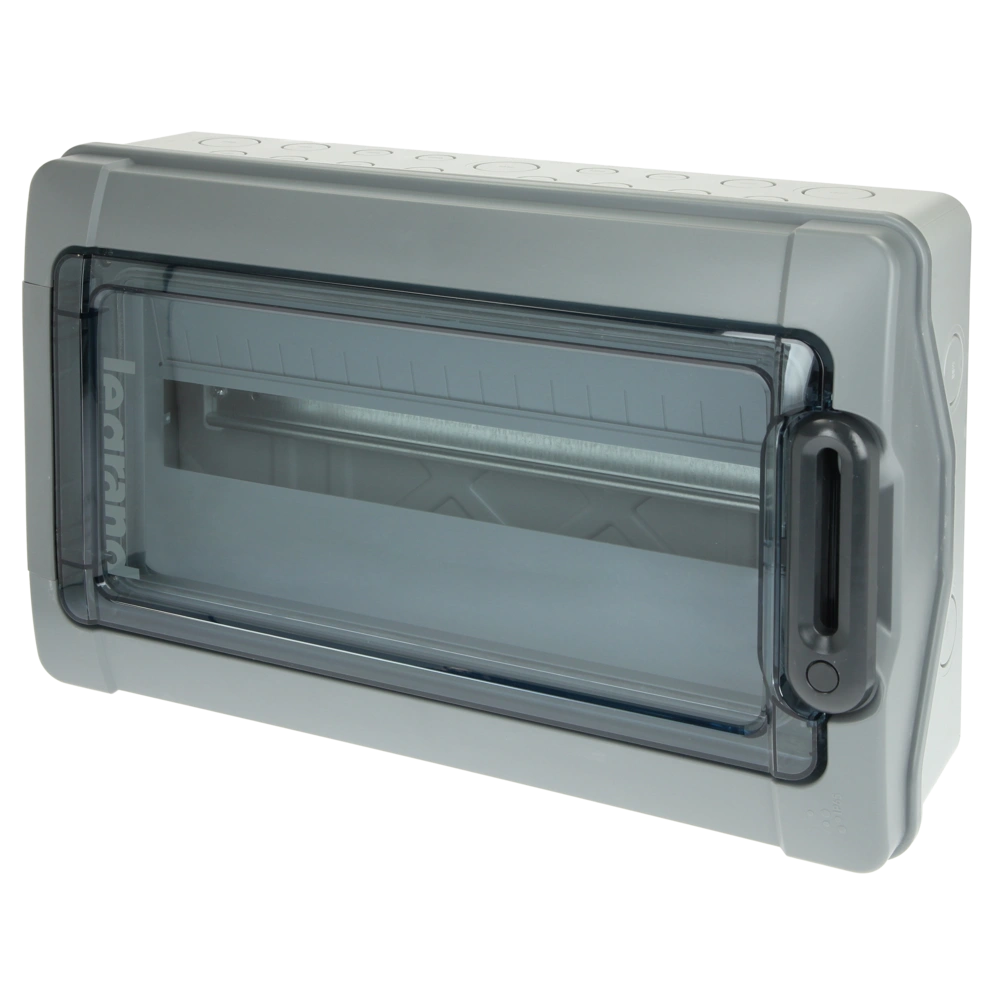 The Legrand Plexo³ surface-mounted wet room distributor is equipped with a reversible, transparent door, a lock can be retrofitted. Behind the height-adjustable mounting rail there is enough space left (45 mm) for cabling...