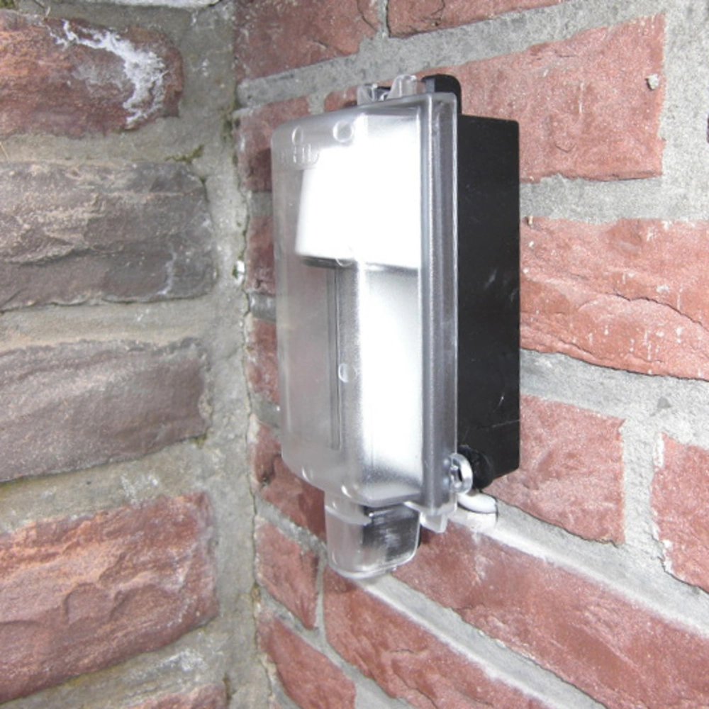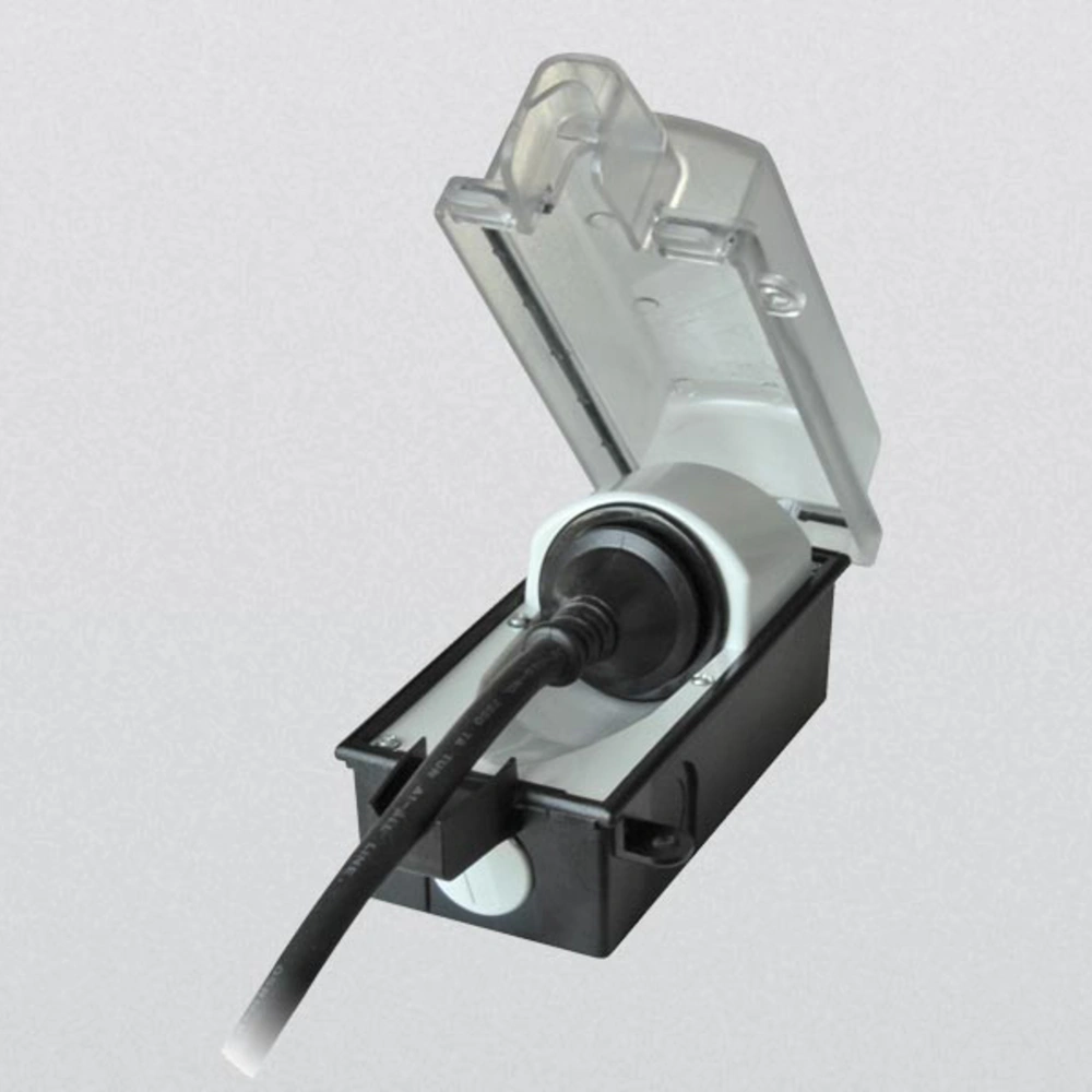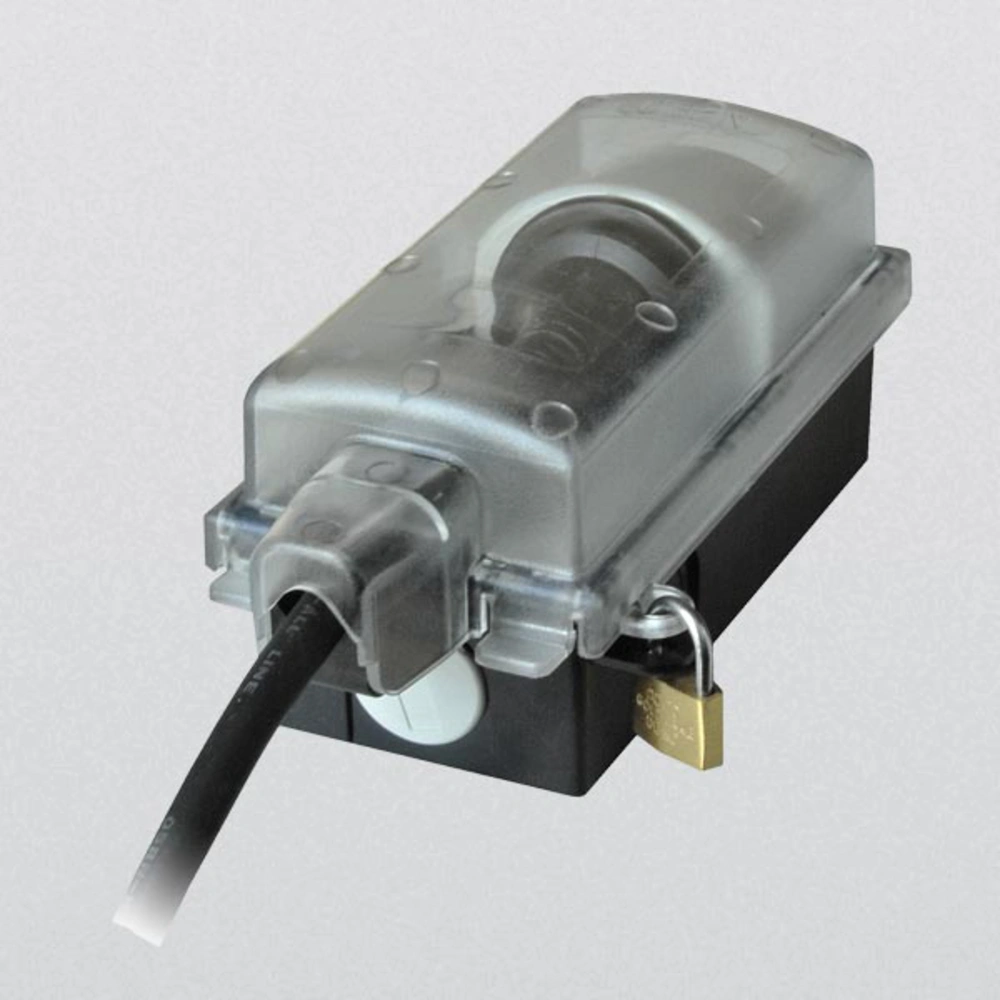 Lockable outdoor socket outlet with increased contact protection, suitable for use in the garden, cellar or garage. The socket outlet for straight plugs is designed exclusively for wall mounting and features a transparent, impact-resistant plastic cover with all-round seal and a tab for a padlock to prevent unauthorised power extraction.