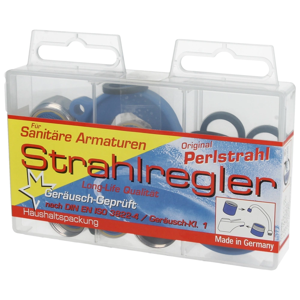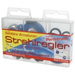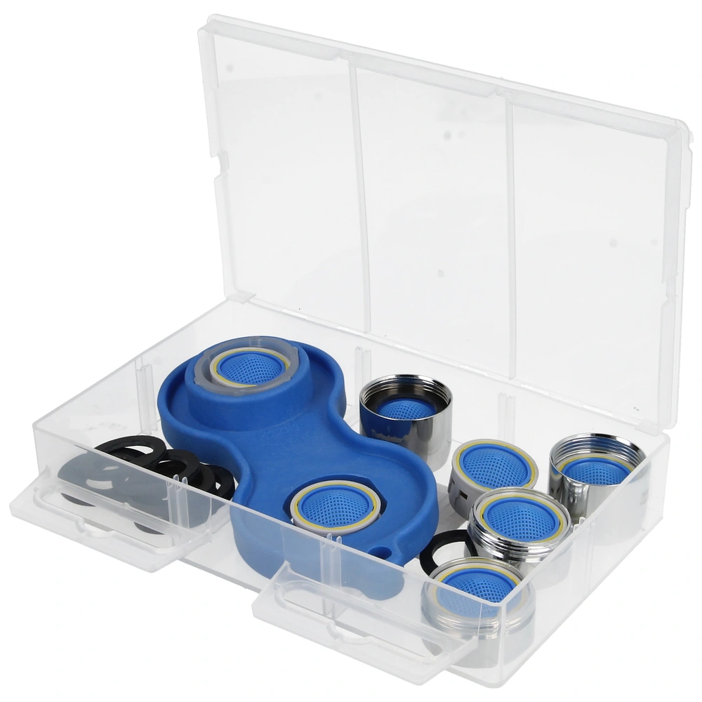 Service box with the most common aerators, seals and a service key. The aerators are fitted with a coarse, moulded-on plastic strainer to prevent limescale deposits.