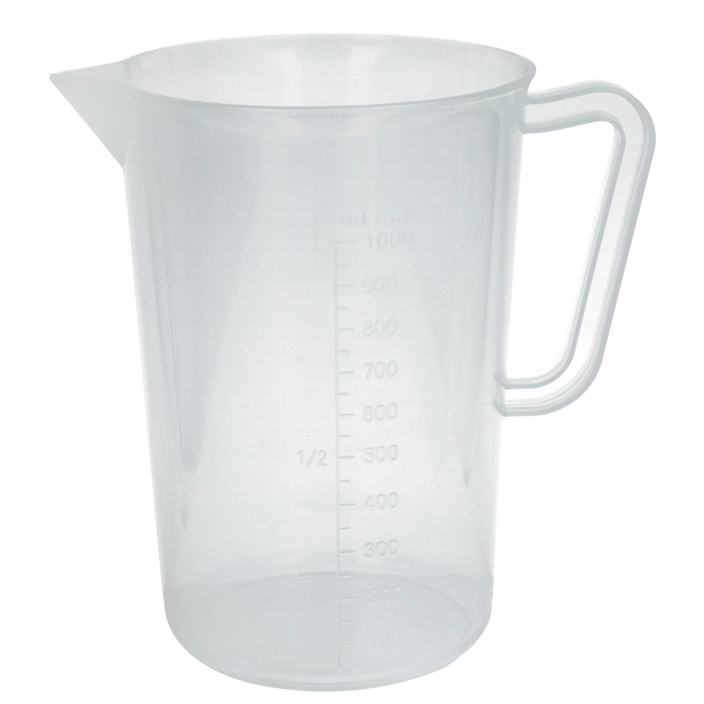 The oil-resistant measuring cup has a clear scale in 50 ml increments and a stable handle.