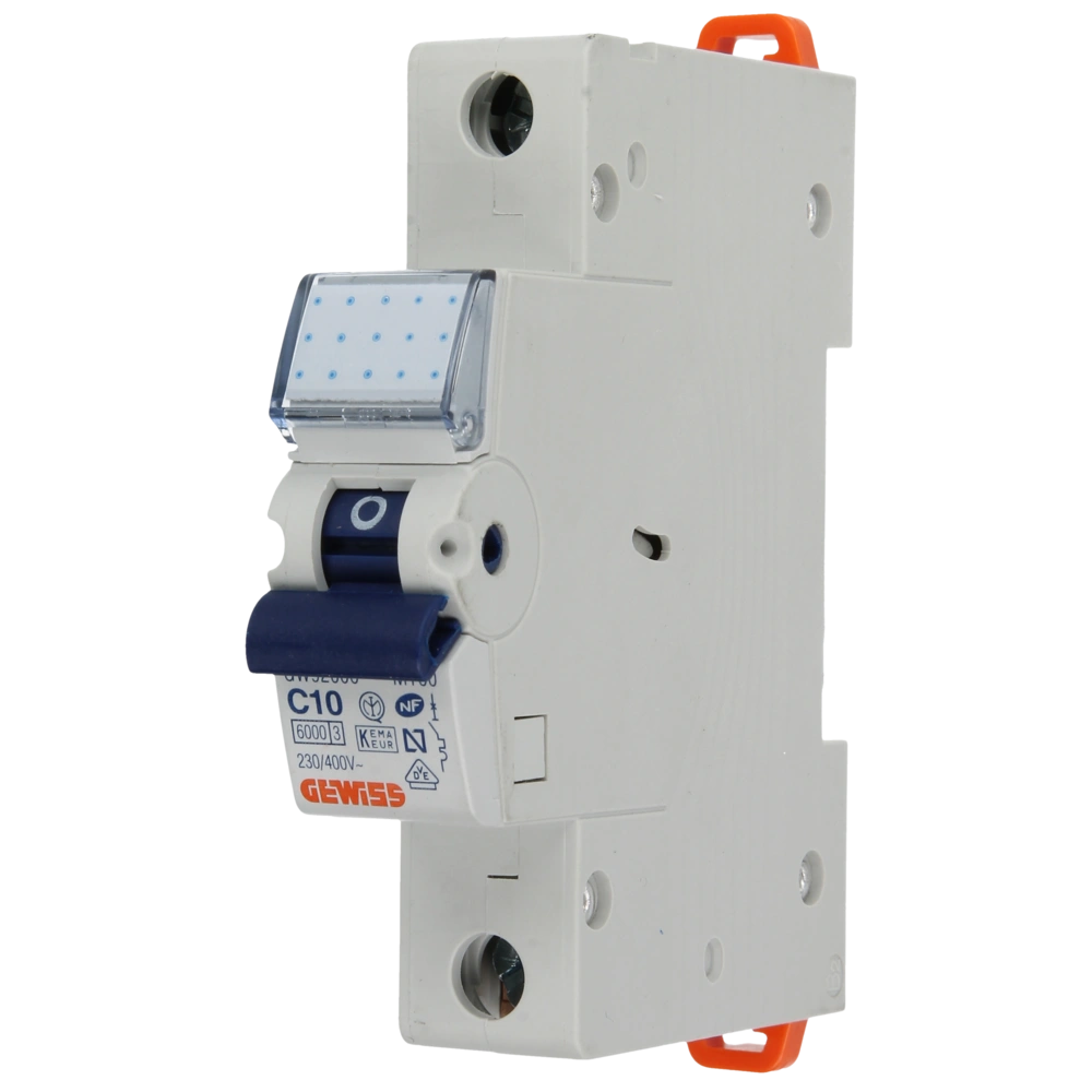 Single-pole miniature circuit breaker for DIN rail mounting to automatically disconnect electrical circuits in case of overload or short circuit.