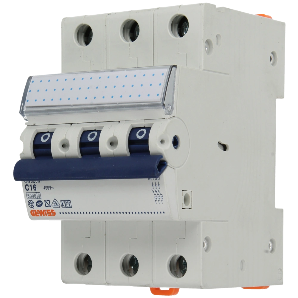 3-pole miniature circuit breaker for DIN rail mounting to automatically disconnect electrical circuits in case of overload or short circuit.