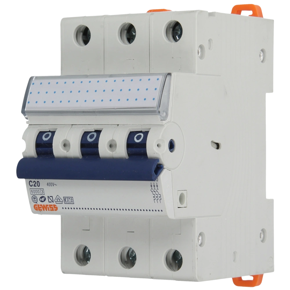 3-pole miniature circuit breaker for DIN rail mounting to automatically disconnect electrical circuits in case of overload or short circuit.