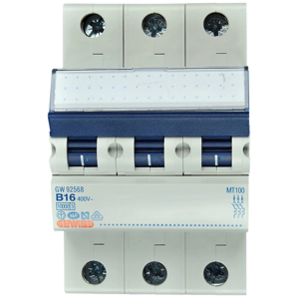 3-pole miniature circuit breaker for DIN rail mounting to automatically disconnect electrical circuits in case of overload or short circuit.