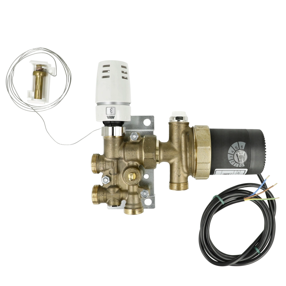 Mixing module for the connection of floor heatings (1-2 heating circuits, up to max. 40 m²) to a radiator circuit; integrated highly efficient spherical motor pump (ErP Ready 2015) with flow excessive-temperature limitation at 55°C; ON/OFF-switch; continuous performance adjustment, settable bypass for the connection to the single-pipe system; vent screw; holder for left- or right-hand connection; Euro cone connection ¾"; integrated room-temperature control consisting of pre-set thermostatic valve (8-28°C) to keep from frost and capillary remote sensor (5 m).