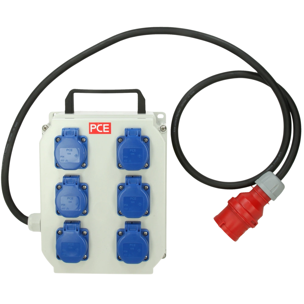 Mobile compact distribution box with carrying handle in robust version as ideal solution for construction sites or workshops. In compact design, therefore, space-saving and easy to stow away.