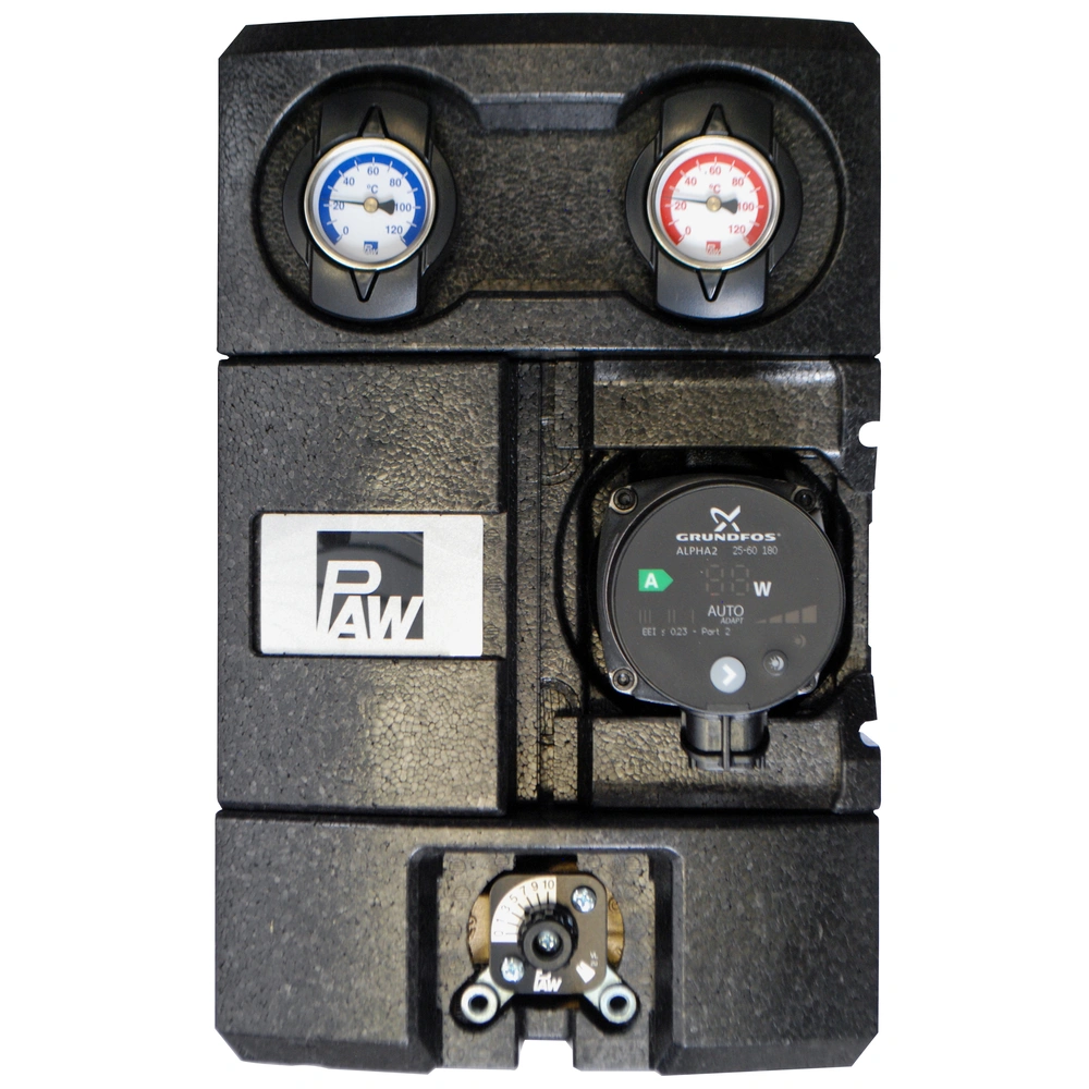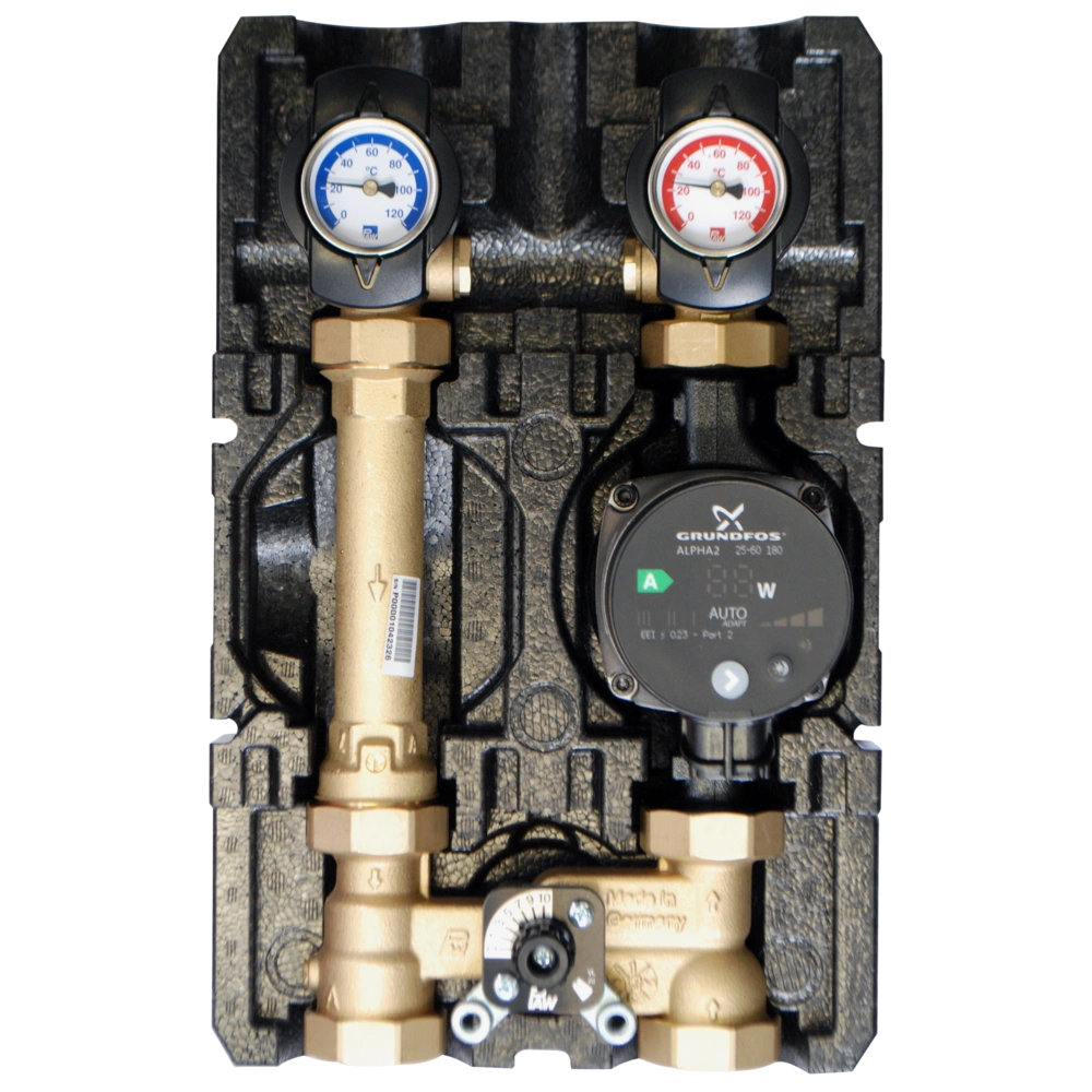 All product informationThe modular heating circuit K32 for heating systems controlled by a mixing valve is equipped with Grundfos Alpha2 25-60. The connections of the heating circuit have an internal thread of 1". It also features large ball valve handles for easy handling and a visible closing position. The modular heating circuit is equipped with a design insulation with optimised function made of durable elastic EPP insulating the fittings 100%. Moreover, the system provides a ventilation opening to cool the pumps. Free access to the pump head is ensured by simply removing the front insulation shell. Additionally, the heating circuit provides a check valve (can be opened, 200-mm water column, spring-loaded) in the return pipe which prevents noise when electronically-controlled pumps are used, thus suited for horizontal and overhead installation. Standard installation of the flow is on the right, but flow and return line can be changed on site. All water-carrying parts are made of brass, the full-metal thermometer can be pulled off, with immersion sleeve integrated in the ball valve. The modular heating circuit is fully assembled with flat gaskets. The pump can be isolated, so no draining is necessary during service work.