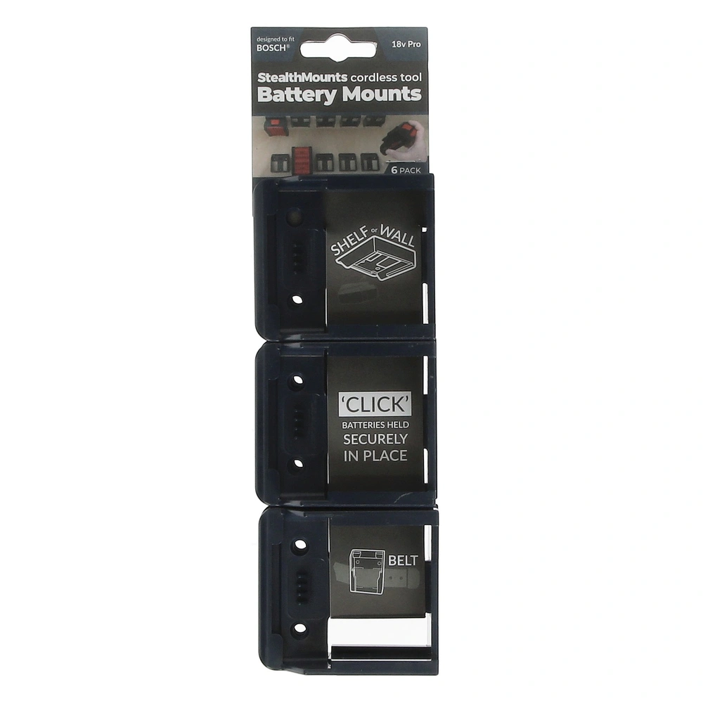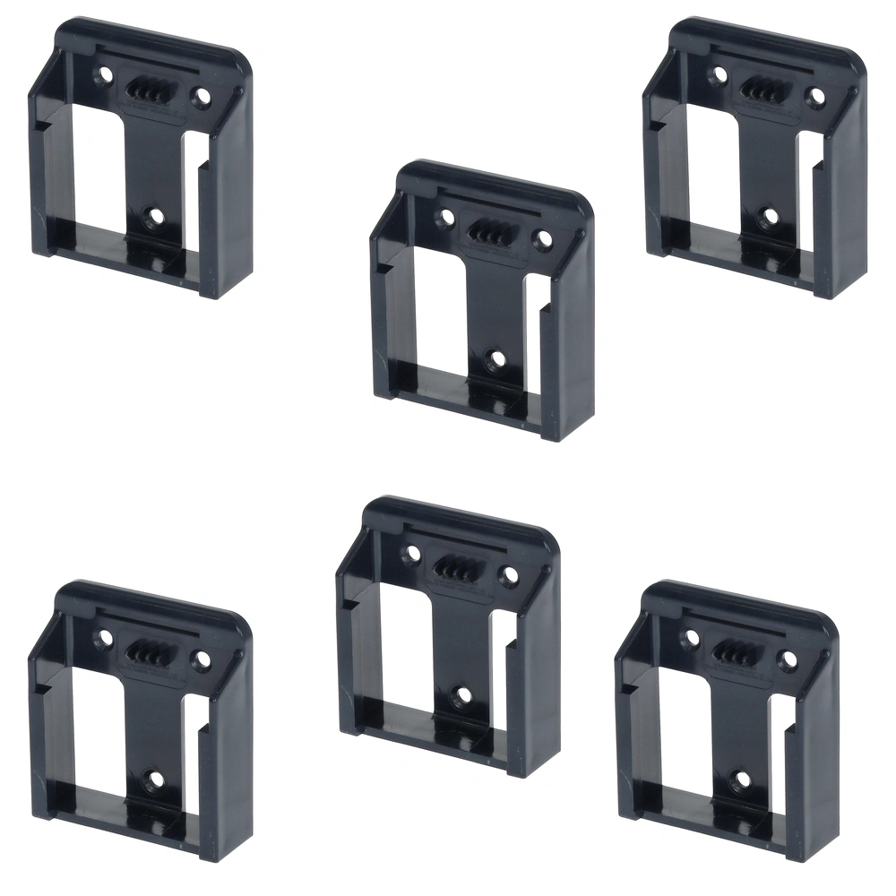Battery mount made of strong ABS plastic for the safe storage of Bosch batteries. The holders can be mounted in any position and distance from one another, and they provide for clear organisation in workshops, tool trailers or work vehicles. They can also be attached to a belt for the use on the job site. The batteries are simply pushed into the holder until they snap in. They are only released by pressing the release button on the battery. Using the battery mounts, your batteries are stowed in a very space-saving way for maximum workshop efficiency.
