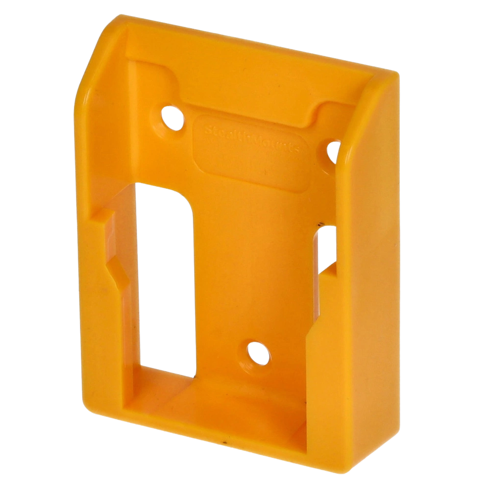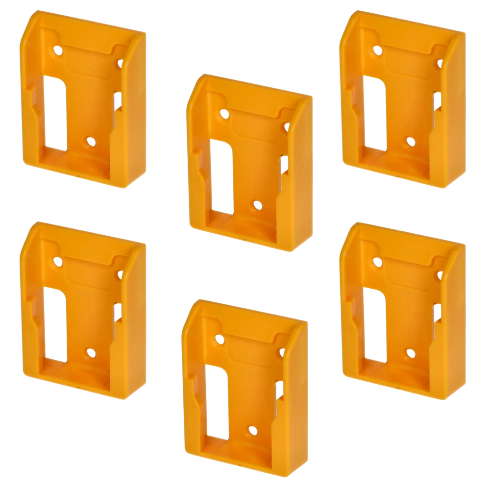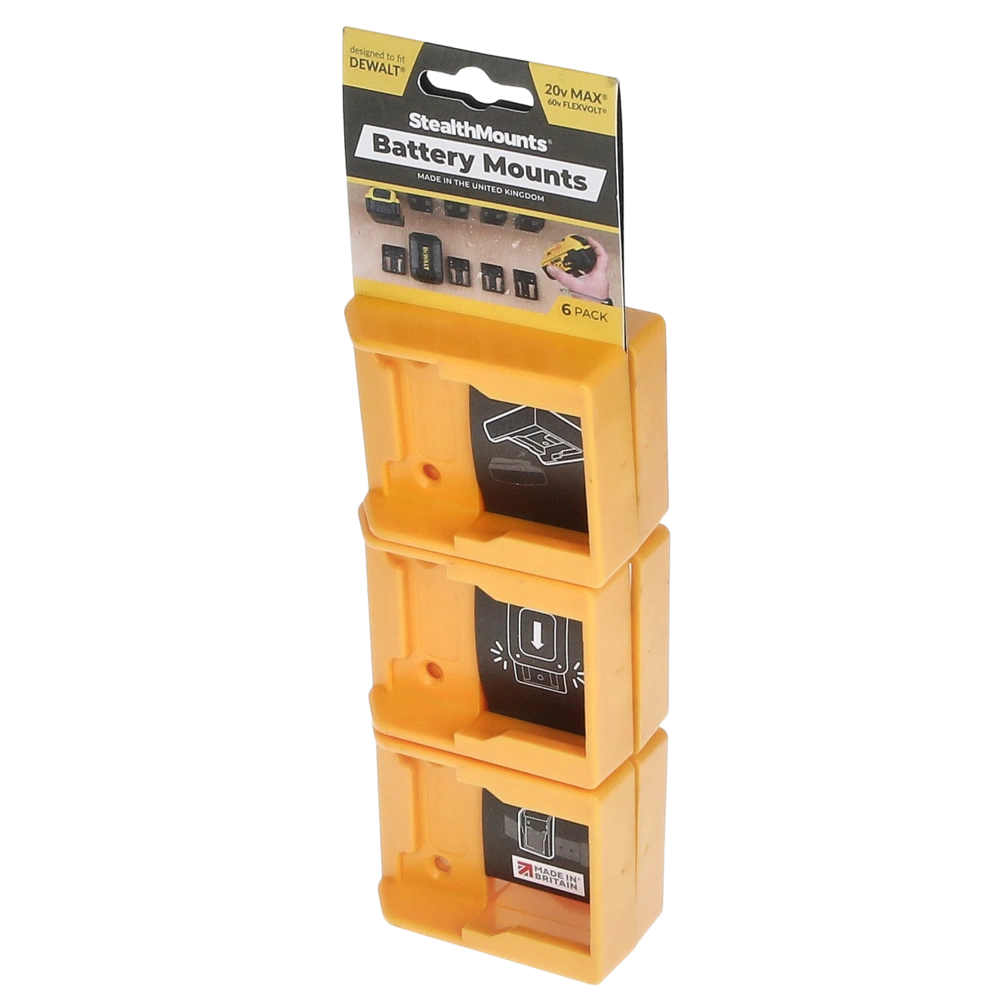 All product informationBattery mount made of strong ABS plastic for the safe storage of Dewalt batteries. The holders can be mounted in any position and distance from one another, and they provide for clear organisation in workshops, tool trailers or work vehicles. They can also be attached to a belt for the use on the job site. The batteries are simply pushed into the holder until they snap in. They are only released by pressing the release button on the battery. Using the battery mounts, your batteries are stowed in a very space-saving way for maximum workshop efficiency
