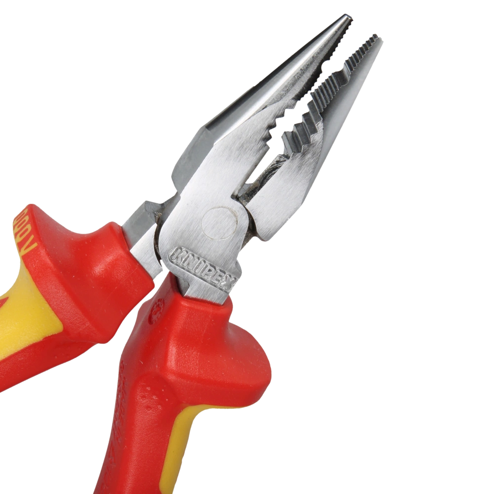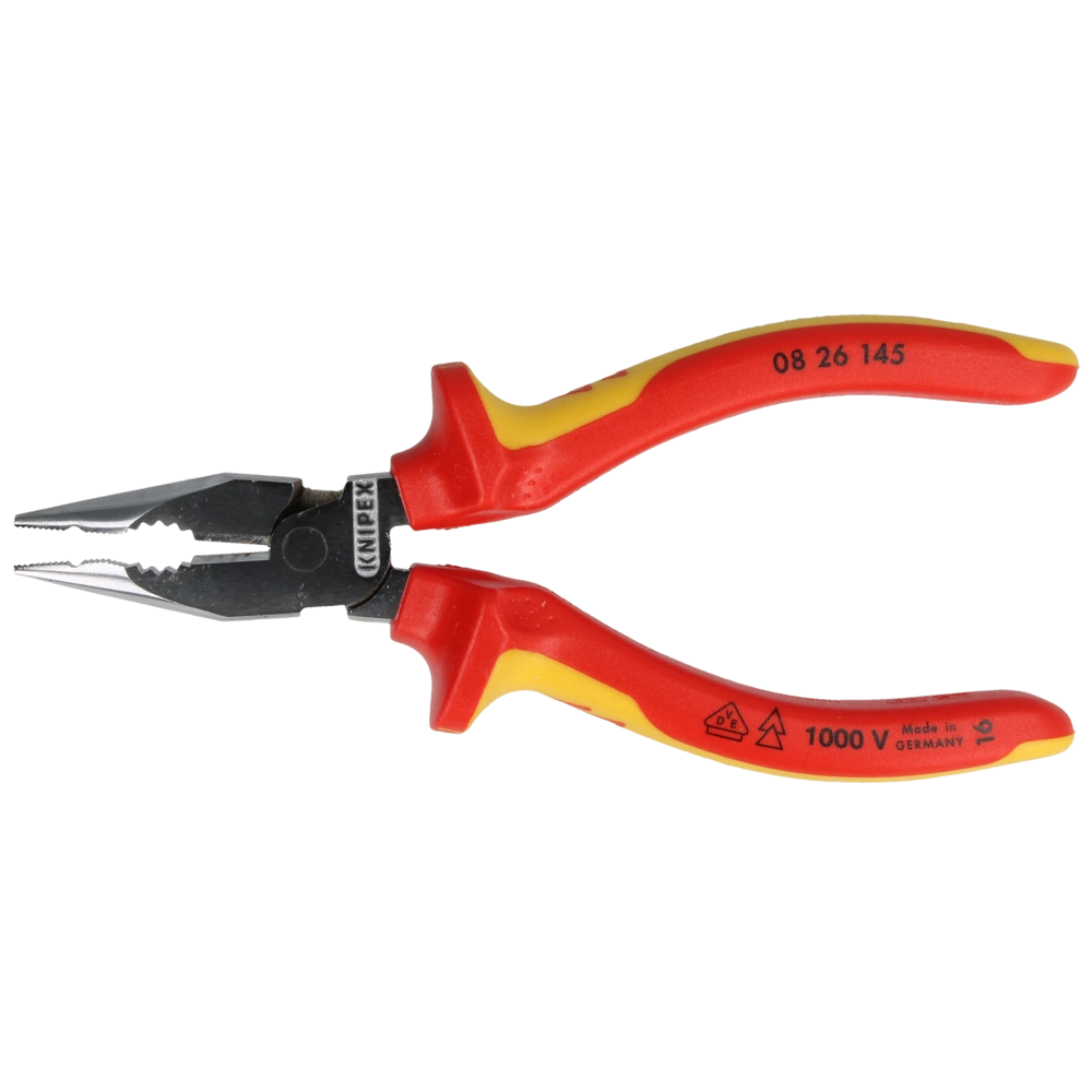 Needle-nose combination pliers made of chrome-plated tool steel for strong gripping and cutting of soft, medium-hard and hard wires. The pliers are provided with precise cutting edges and stable tips for heavy duty and long service life. The milled groove in the gripping area allows for small parts such as nails, pins and bolts to be held and pulled.
