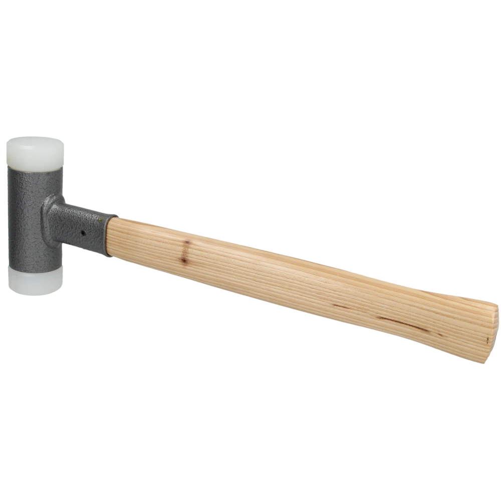 Soft-faced mallet with replaceable nylon head and ash handle. The head is fixed to the handle with a ring wedge.