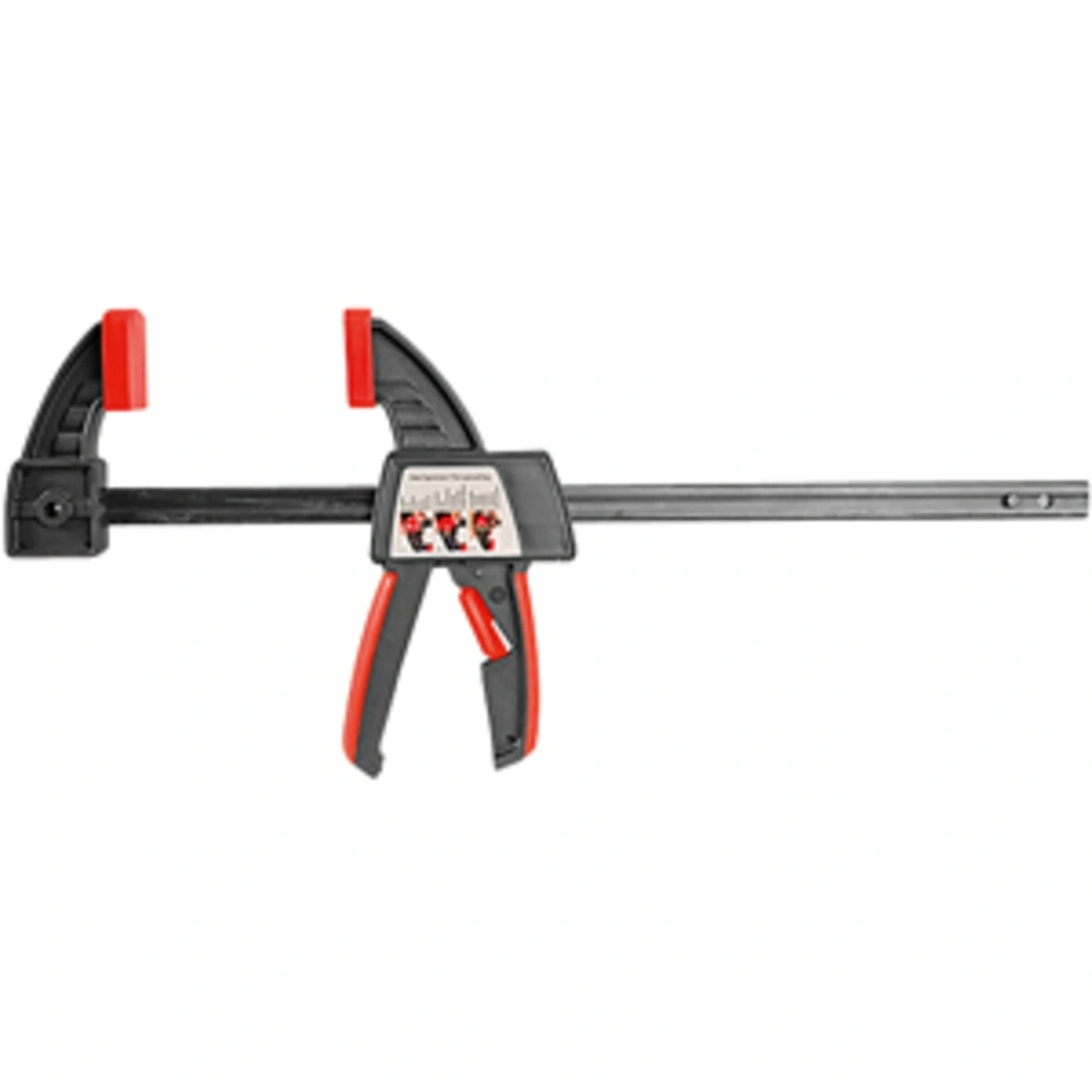 One-handed clamp for connecting and fixing workpieces. The bar clamp is provided with an ergonomically shaped 2-component plastic handle with pump lever and protective plastic caps on the clamping surfaces for careful and secure clamping of the material. Due to the intelligent release mechanism, the upper section of the clamp can be quickly and easily converted from clamping to spreading.