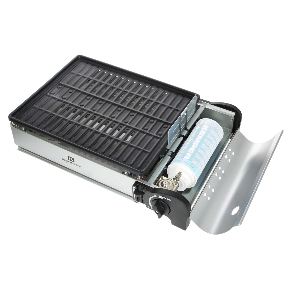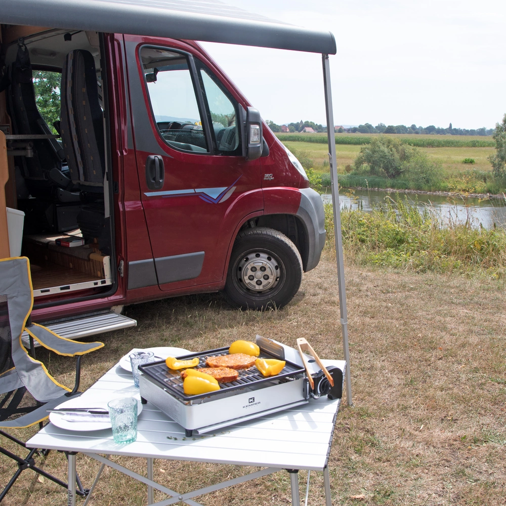 Powerful outdoor grill made of stainless steel with piezo ignition for gas pressure cartridges. The aluminium grid with non-stick coating and the grease tray can be removed for cleaning. The grill is supplied in a practical carry bag for easy transport.