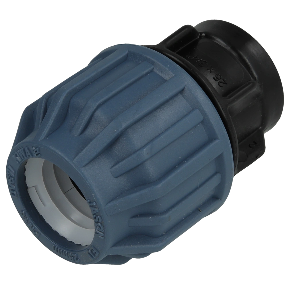 PE compression connection fitting with female thread for jointing PE pipes.